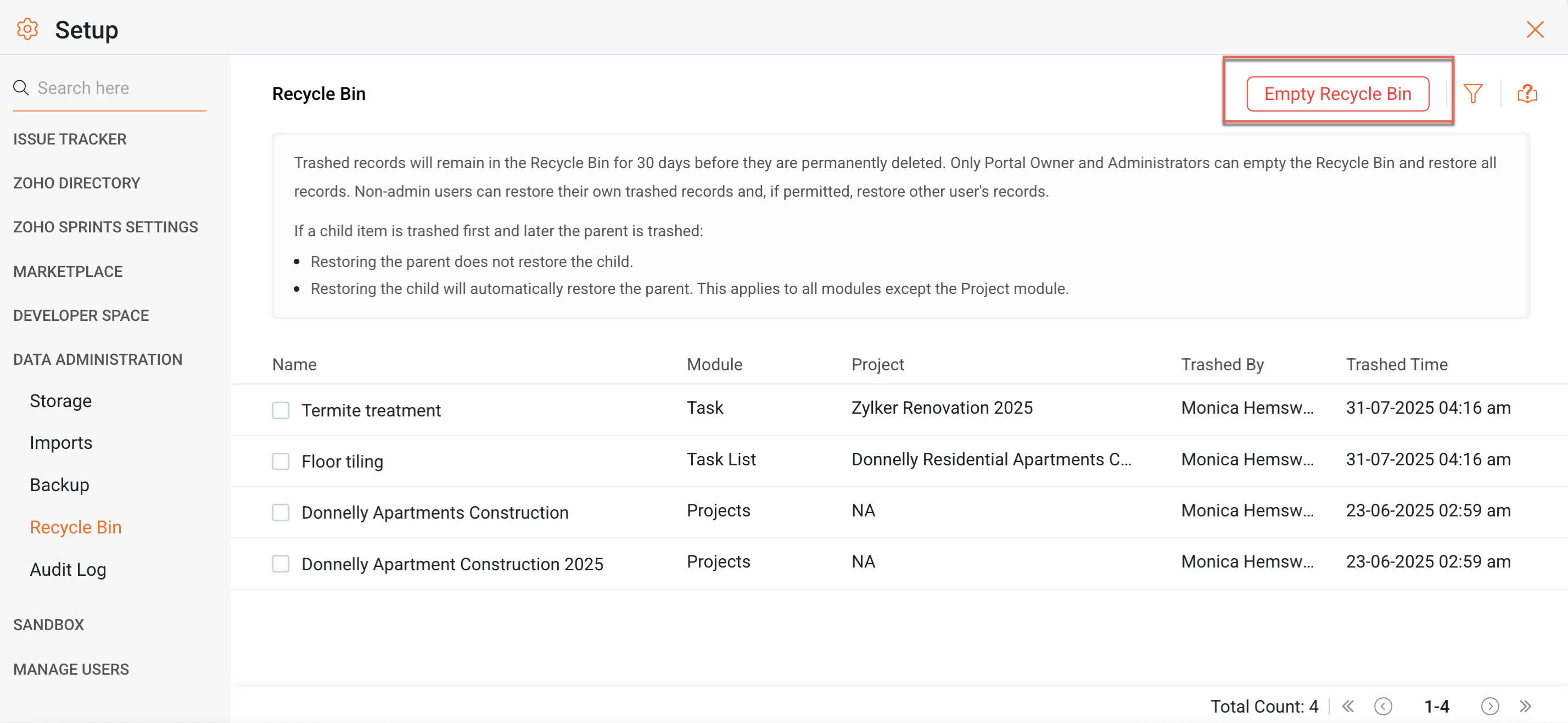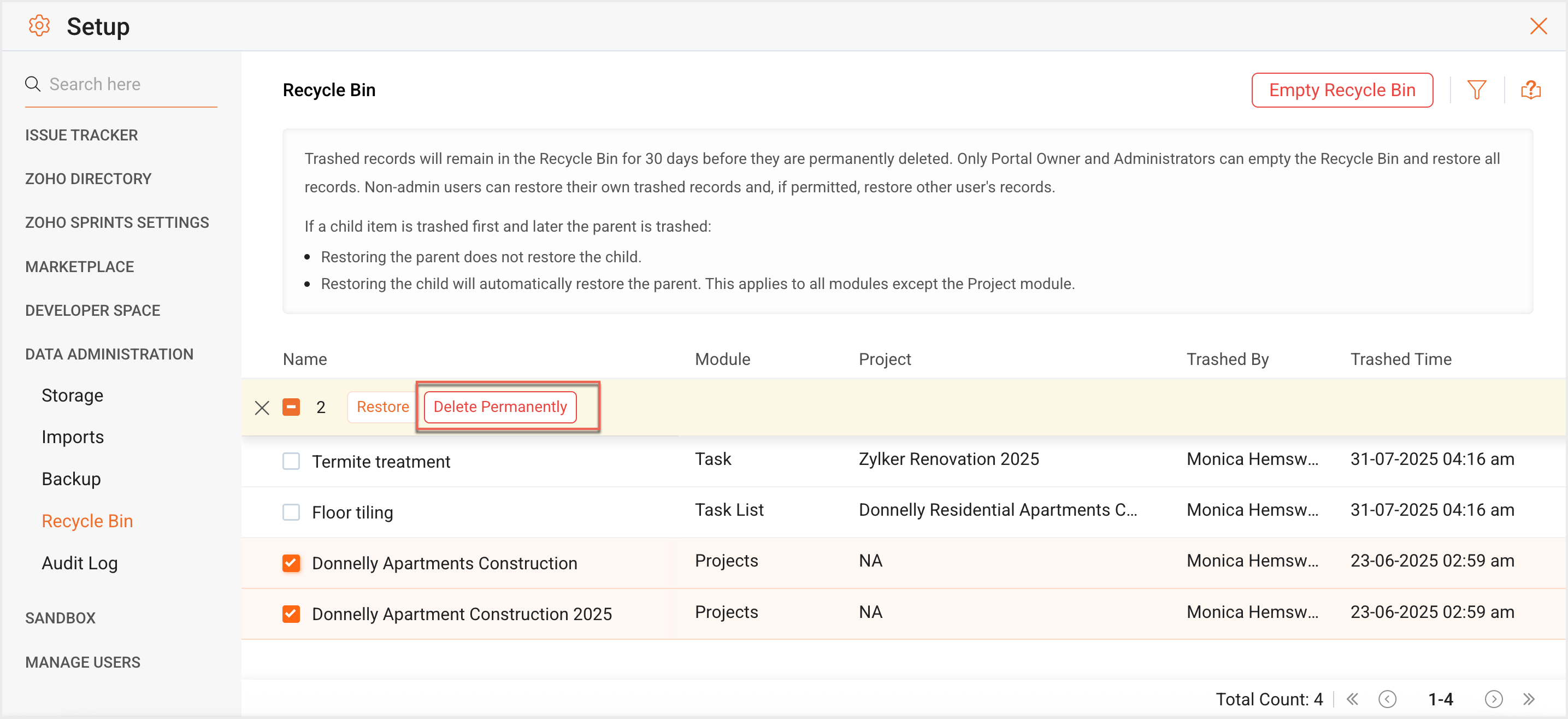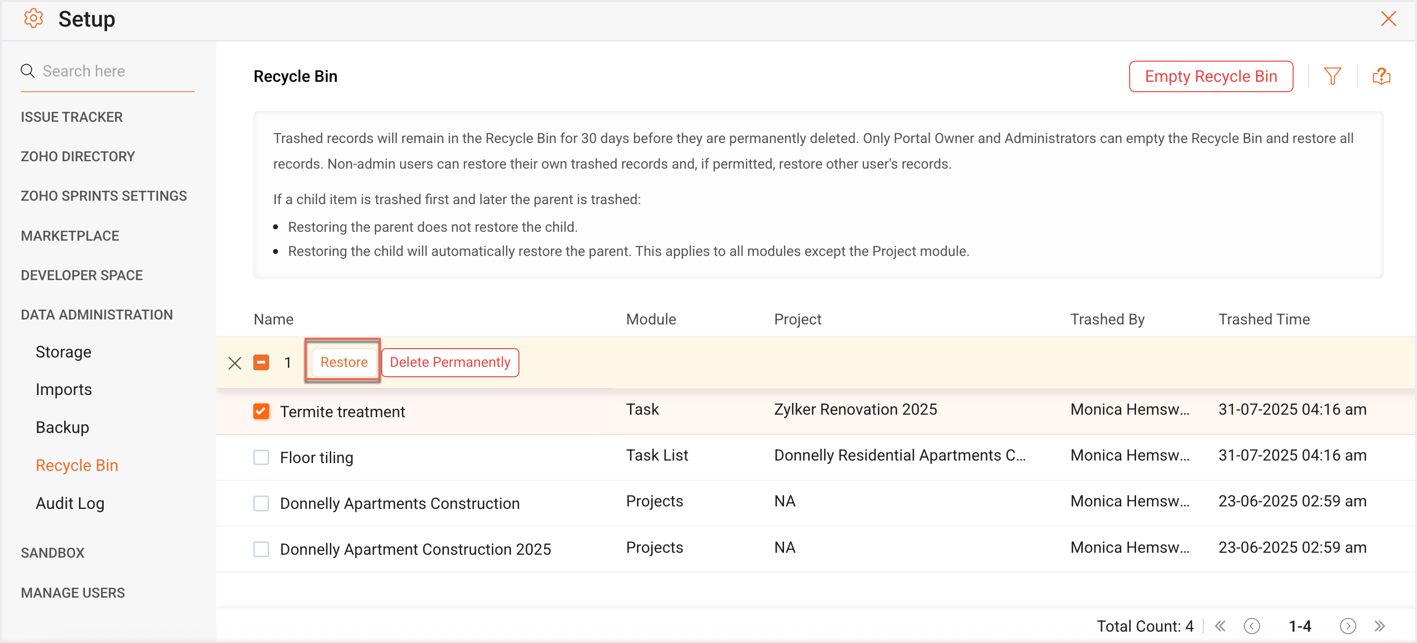 1. Trashed tasks in Zoho Projects will be moved to the Recycle Bin and in Zoho CRM's Recycle Bin.