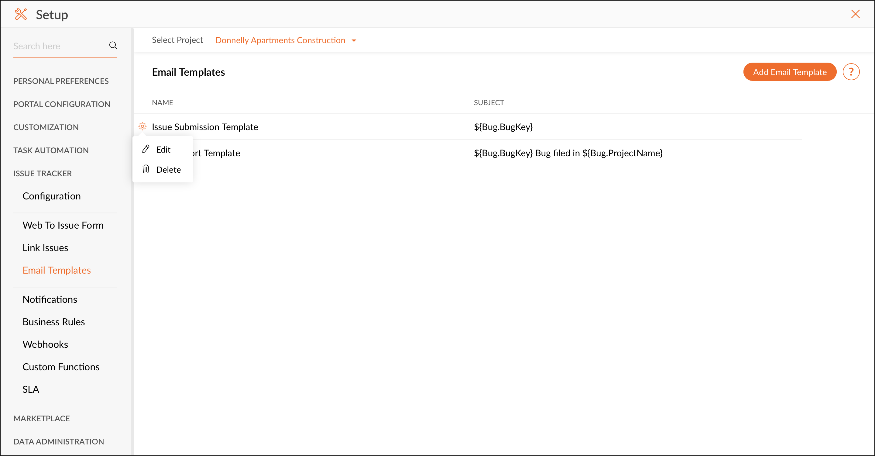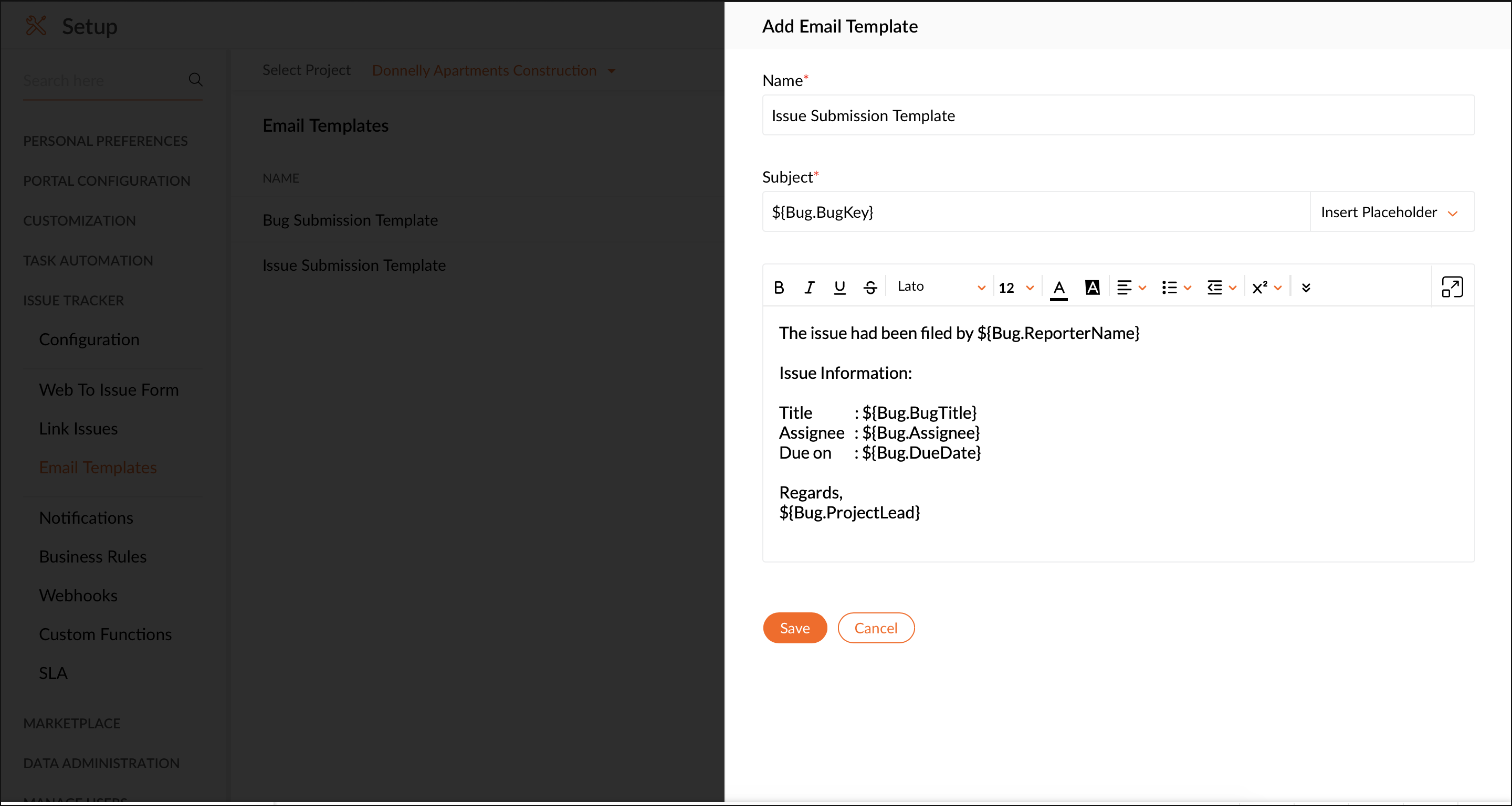 Communication plays a significant role in project management. Emails have become handy in the business world to communicate effectively. Zoho Projects very well understands this fact and it provides Email Templates to customize the automated emails according to your need. With Email Templates, you can customize the notification mail structure for various events i.e. when an issue is created, updated, deleted etc.,. You can associate the Email templates to any notification event or an SLA.