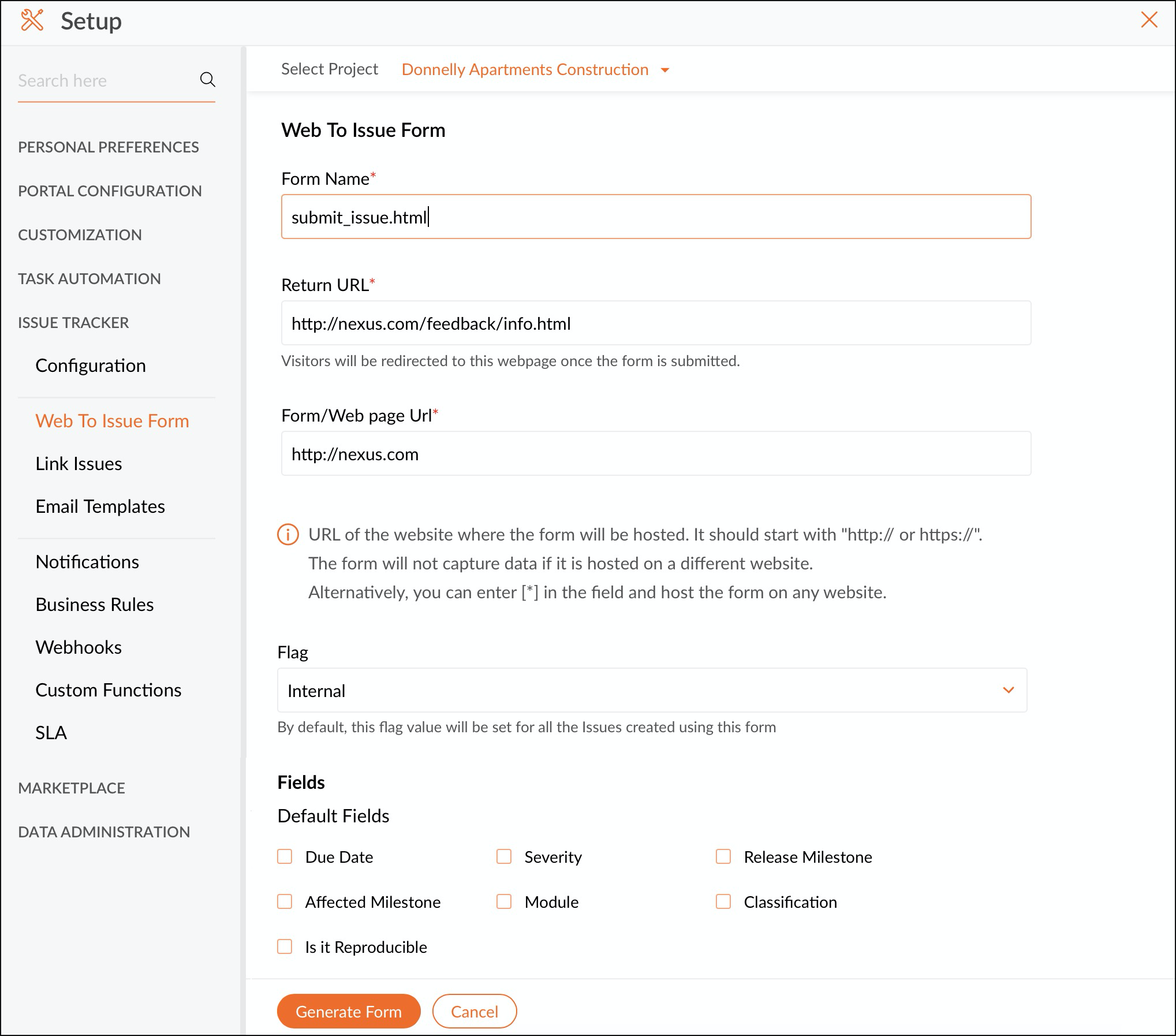 > Issue Tracker and select Web To Issue Form.