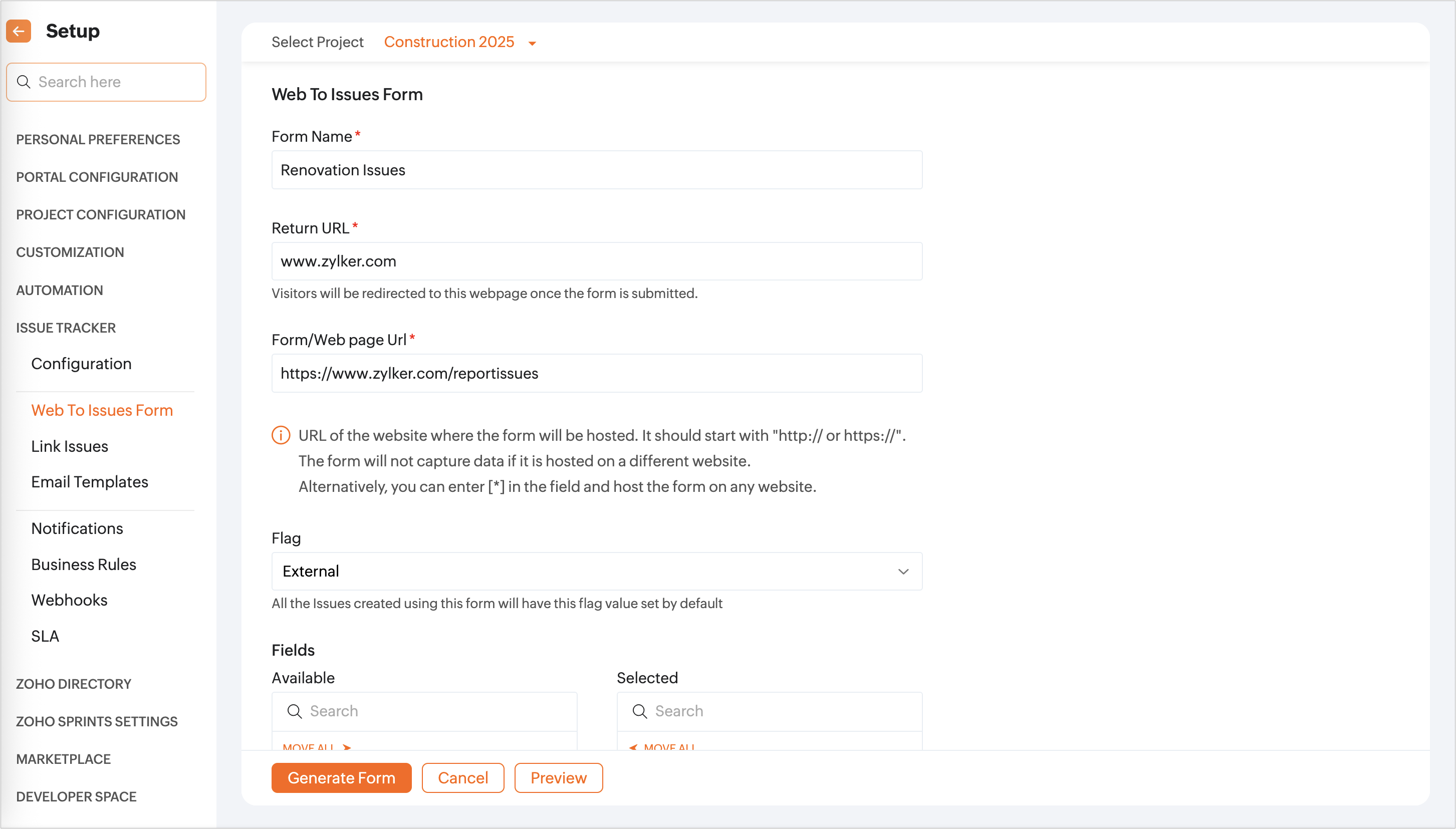 - Select the custom fields if available. Only fields for which the access permission is set to All Users (this permission can be granted when adding custom field to the Issue Layout) will be available in the web to issue form.