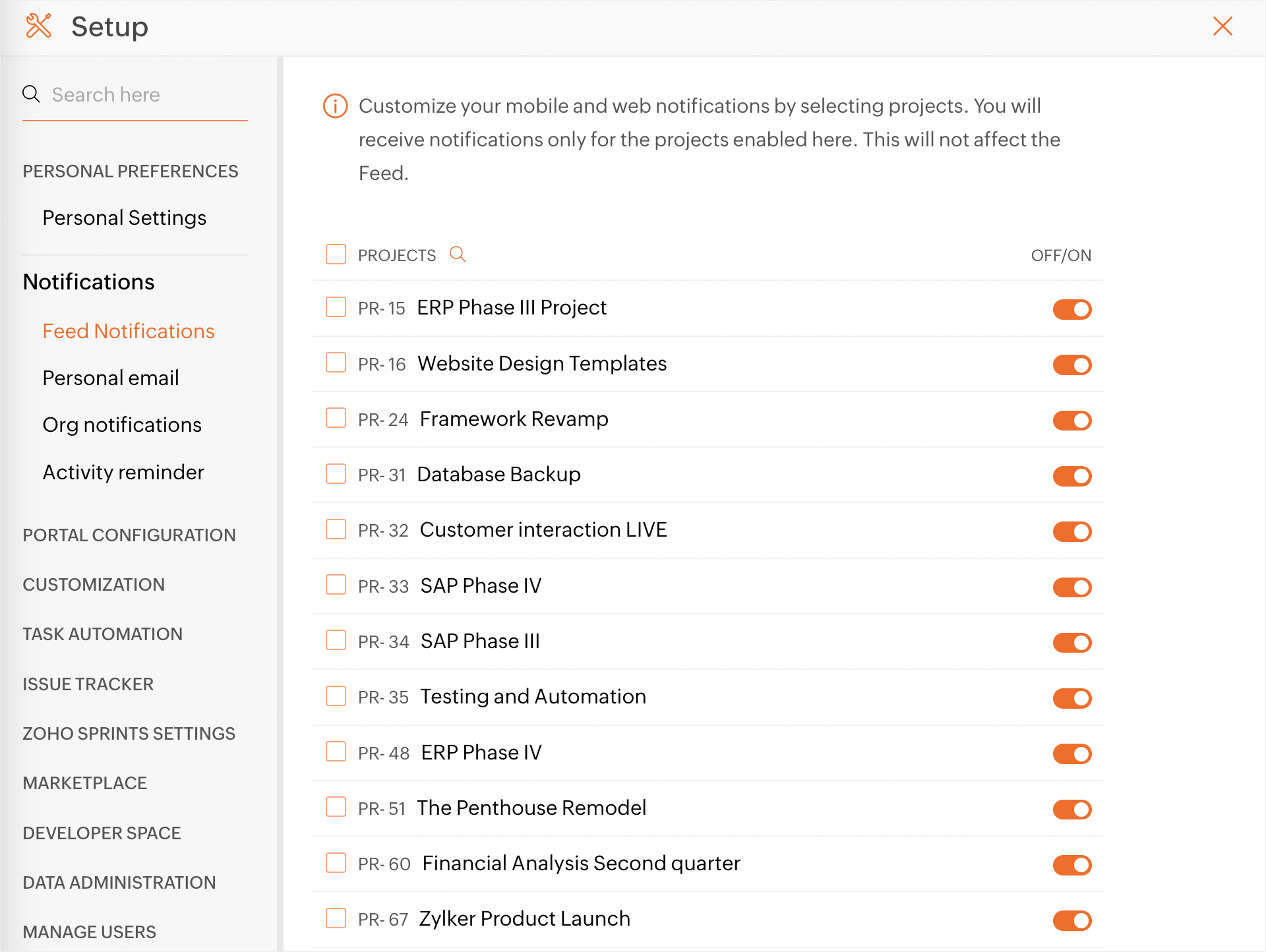 Control the web and mobile notifications in Zoho Projects. Select projects to receive specific notifications and reduce clutter.