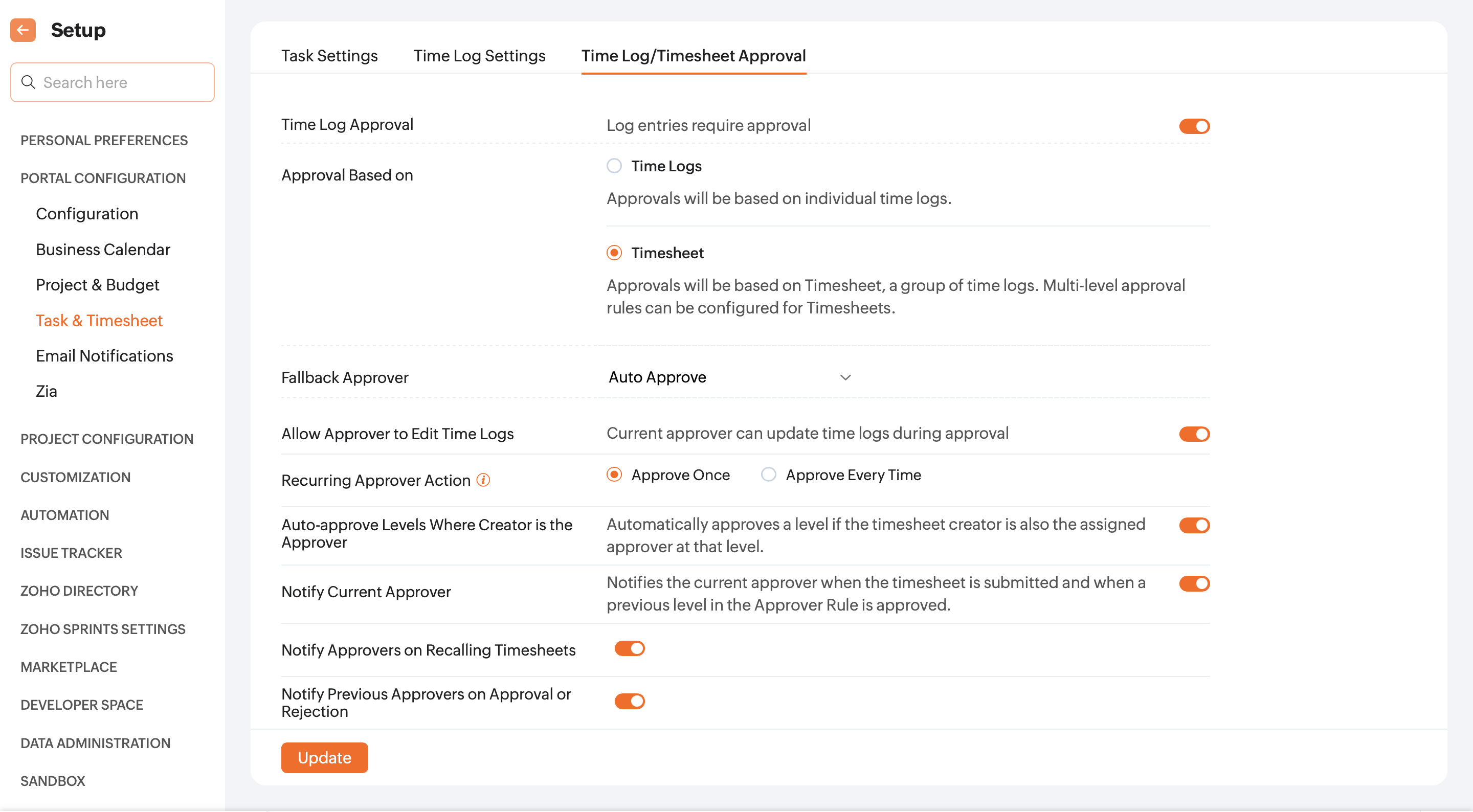 in the top navigation panel. - Navigate to Portal Configuration > Task & Timesheet > Time Log /Timesheet Approval tab.
