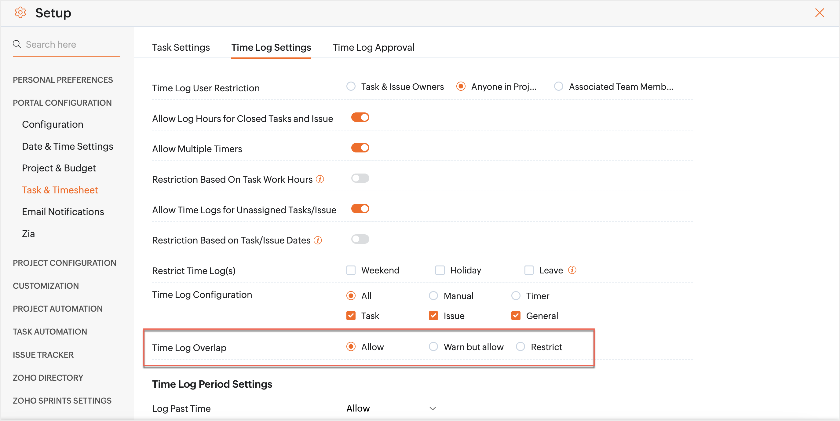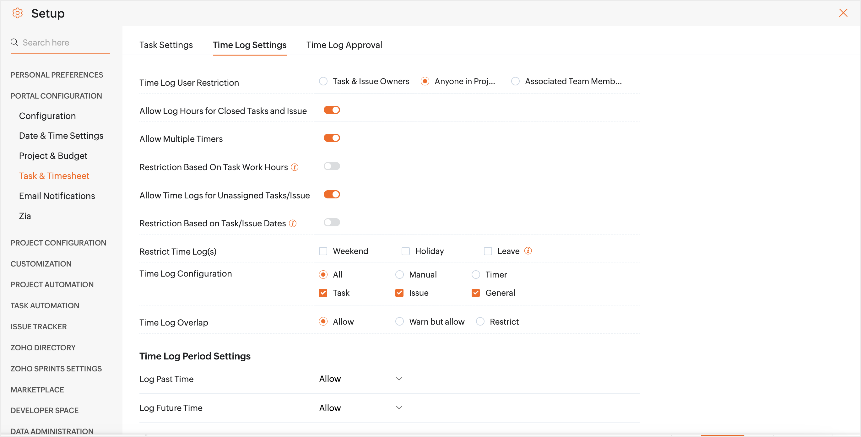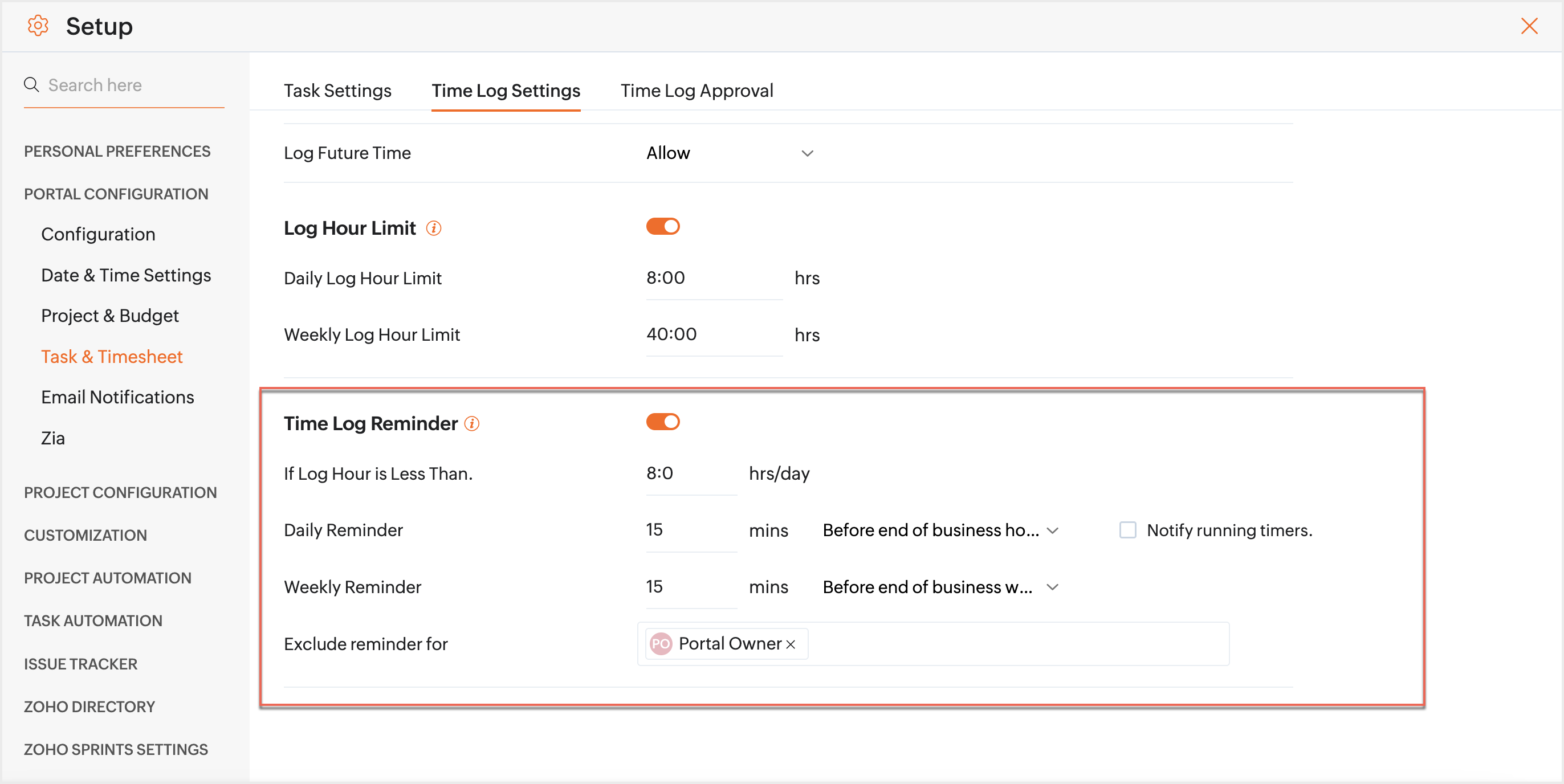 in the top navigation panel. Navigate to Portal Configuration > Task & Timesheet > Time Log Settings tab.