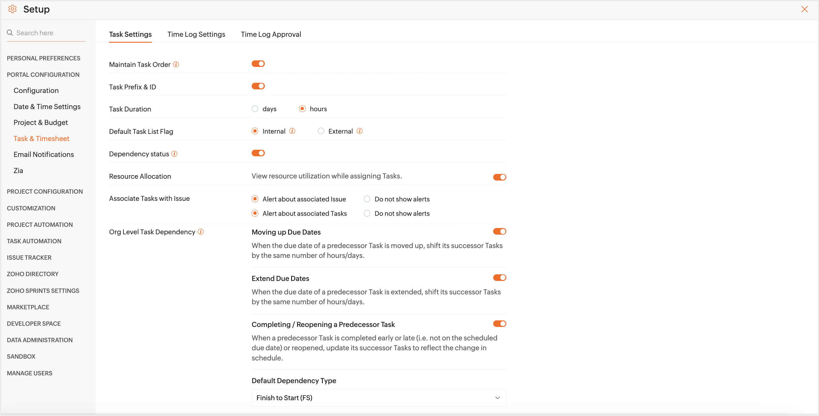You can configure the task dependency settings for your portal here. These options allow you to manage the shift in successor task every time the associated predecessor task is moved.