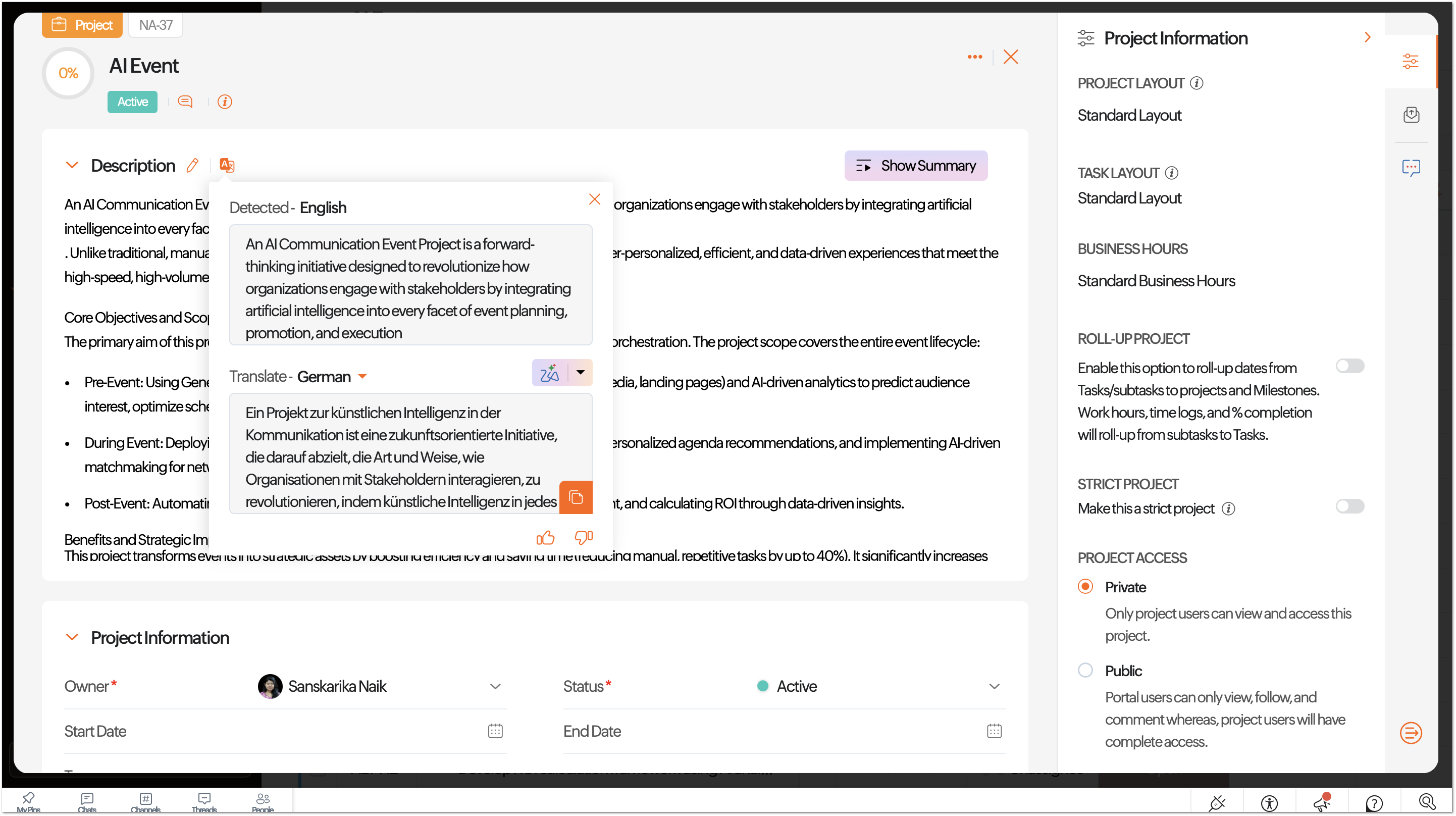Translate text from over 70 languages using all the available AI tools. Choose from AI tools: Zia, ChatGPT, Gemini, Anthropic and Cohere to translate descriptions, comments, Project, Phase, Task and other module names. Teams working from across the globe and consisting of members, stakeholders, and clients from different countries speaking different languages can use AI translate to translate project requirements into their preferred languages.