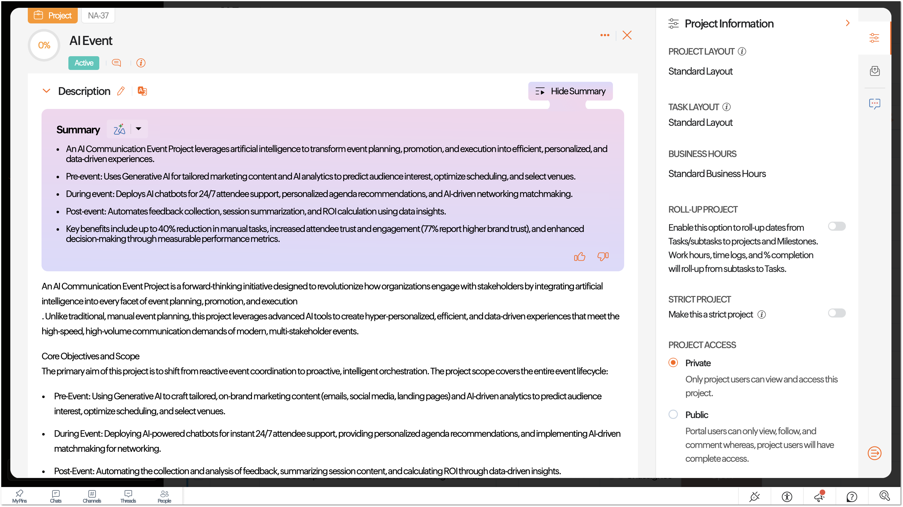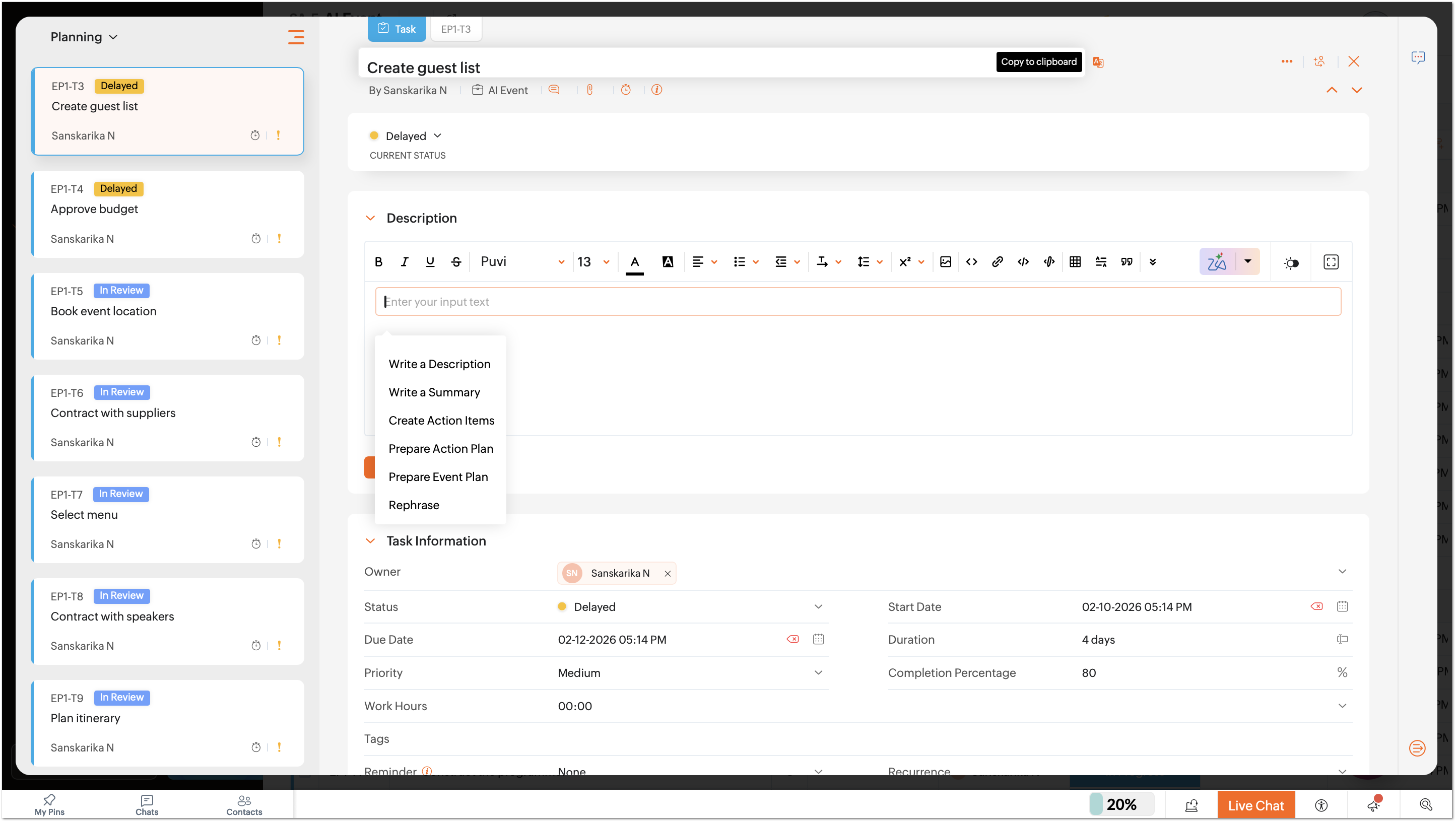 Generate content within Zoho Projects using AI. This includes generating descriptions, writing a summary, rephrasing content, creating action items, action plan and event plan. Users can generate detailed module descriptions, concise summaries of project updates, and well-defined action items based on existing inputs or discussions in comments.