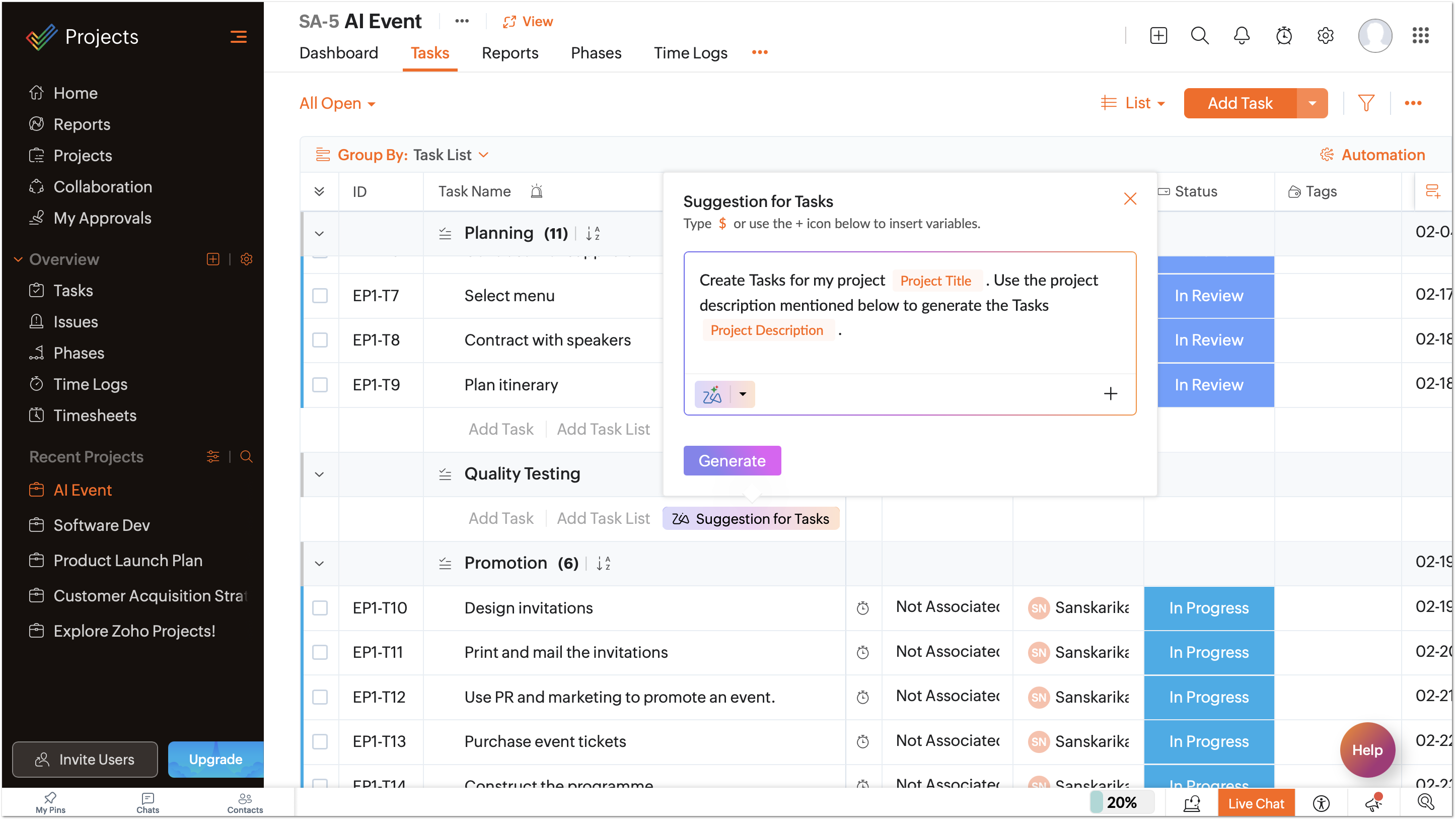 Create tasks and subtasks using AI within Zoho Projects. Provide clear description and accurate Task list name to enable AI to break down processes and create appropriate tasks and subtasks. A project manager can use AI-powered task creation to create tasks for a website launch task list instead of manually breaking down the tasks. With a description like“Plan and launch a responsive e-commerce website with payment integration and user authentication" they can trigger AI to generate tasks. The AI engine analyzes the requirement and generates a list of tasks and subtasks. After scanning through the generated tasks options, the manager can select the relevant ones and add them as tasks.