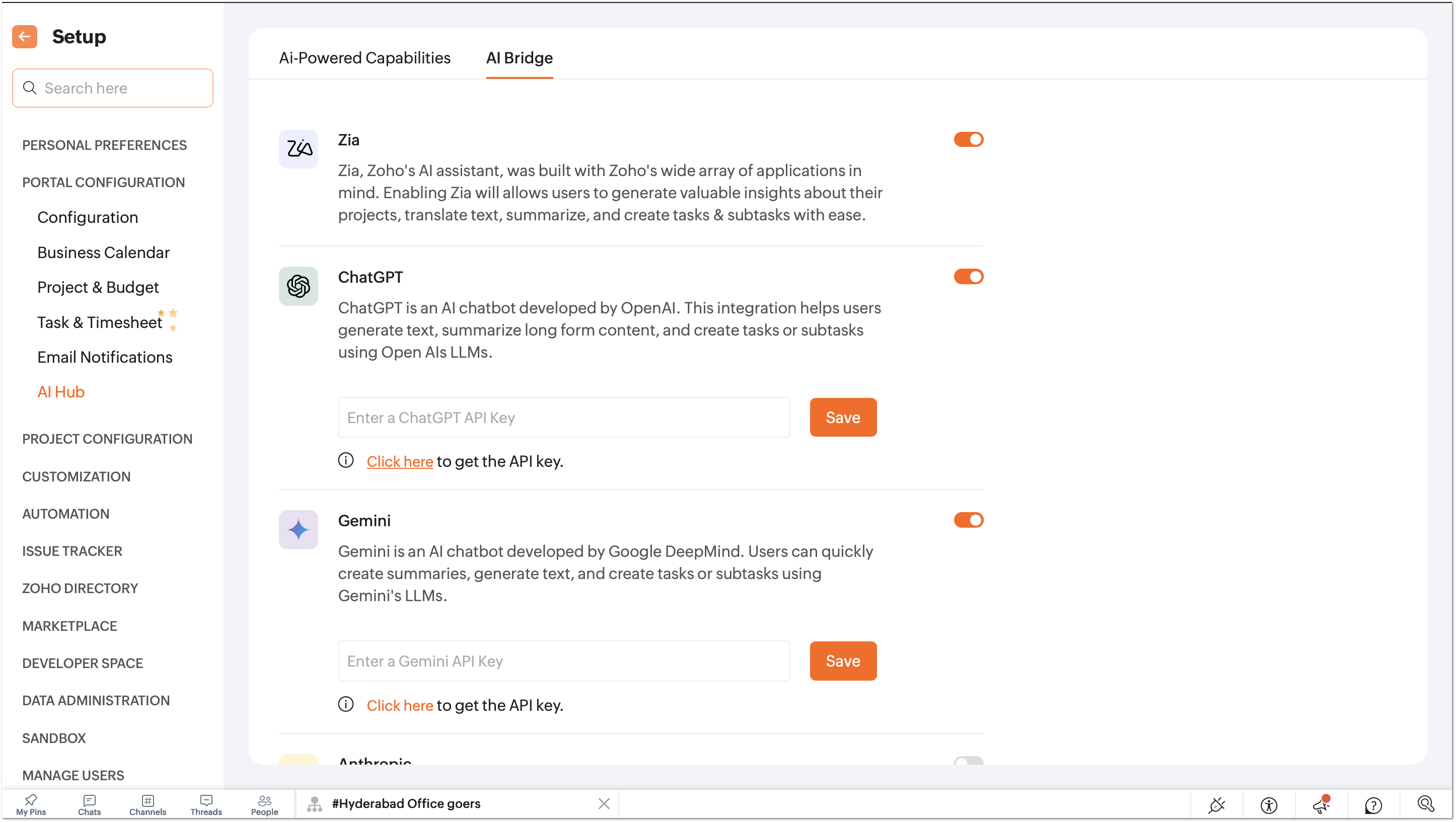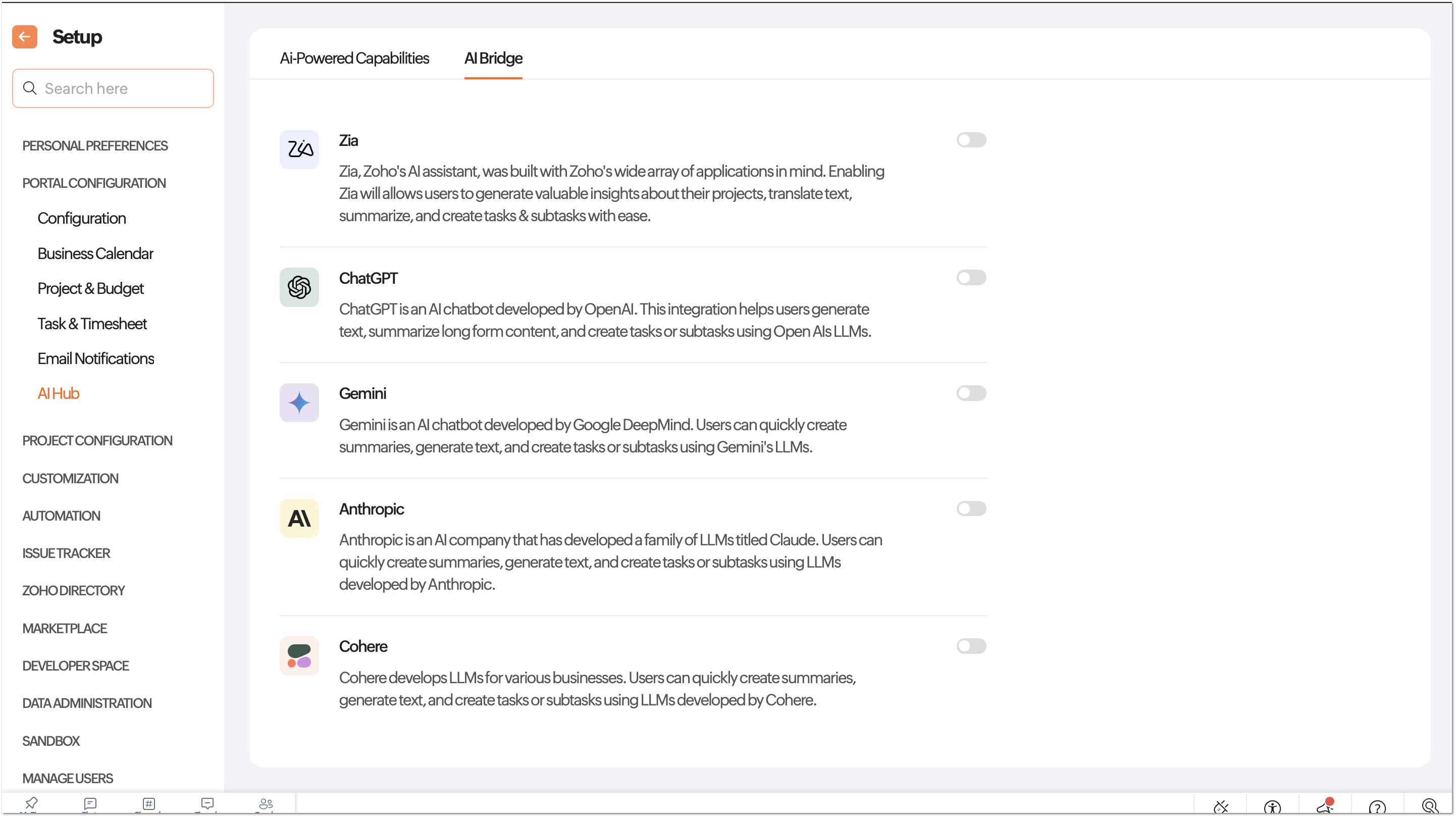 AI Bridge tab is for enabling or disabling AI engines at the portal level. Admins can enable multiple AI engines to make AI-powered services available across the portal. When enabled, AI features such as content generation, task and subtask creation, text summarization, and translation can be executed. Enable the AI engine's toggle and enter their respective API key to configure them to Zoho Projects AI Hub.