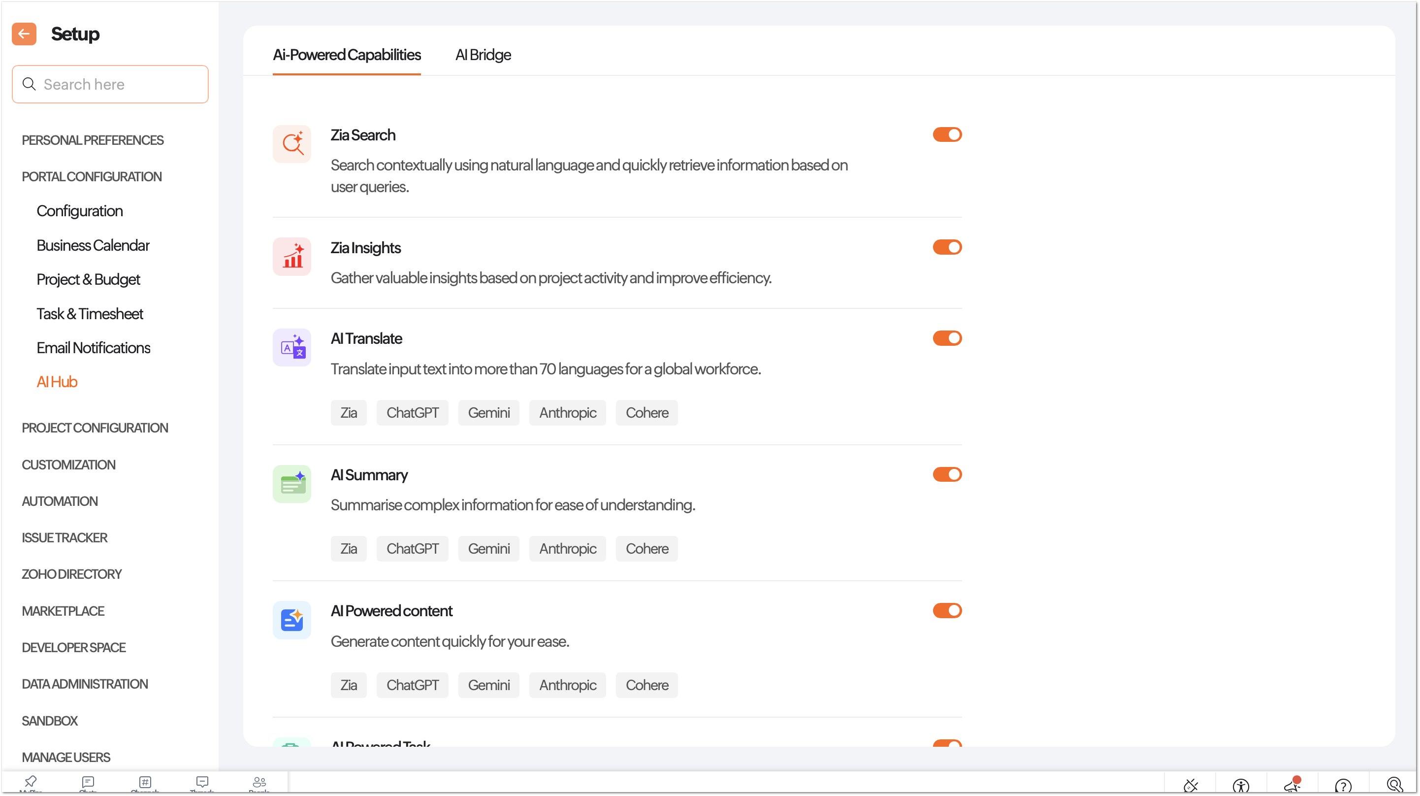 - Enable the AI engine toggle that you wish to bridge with Zoho Projects.