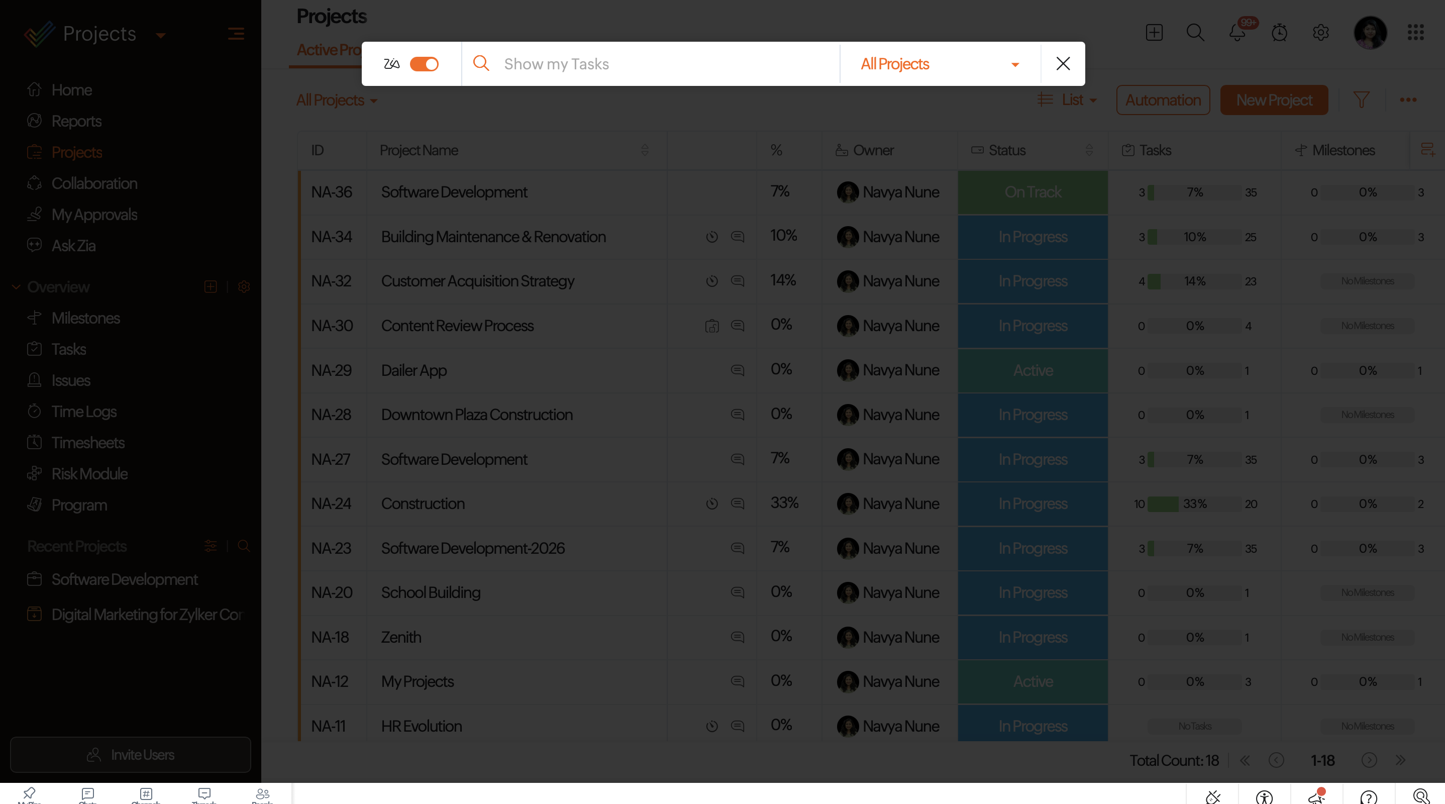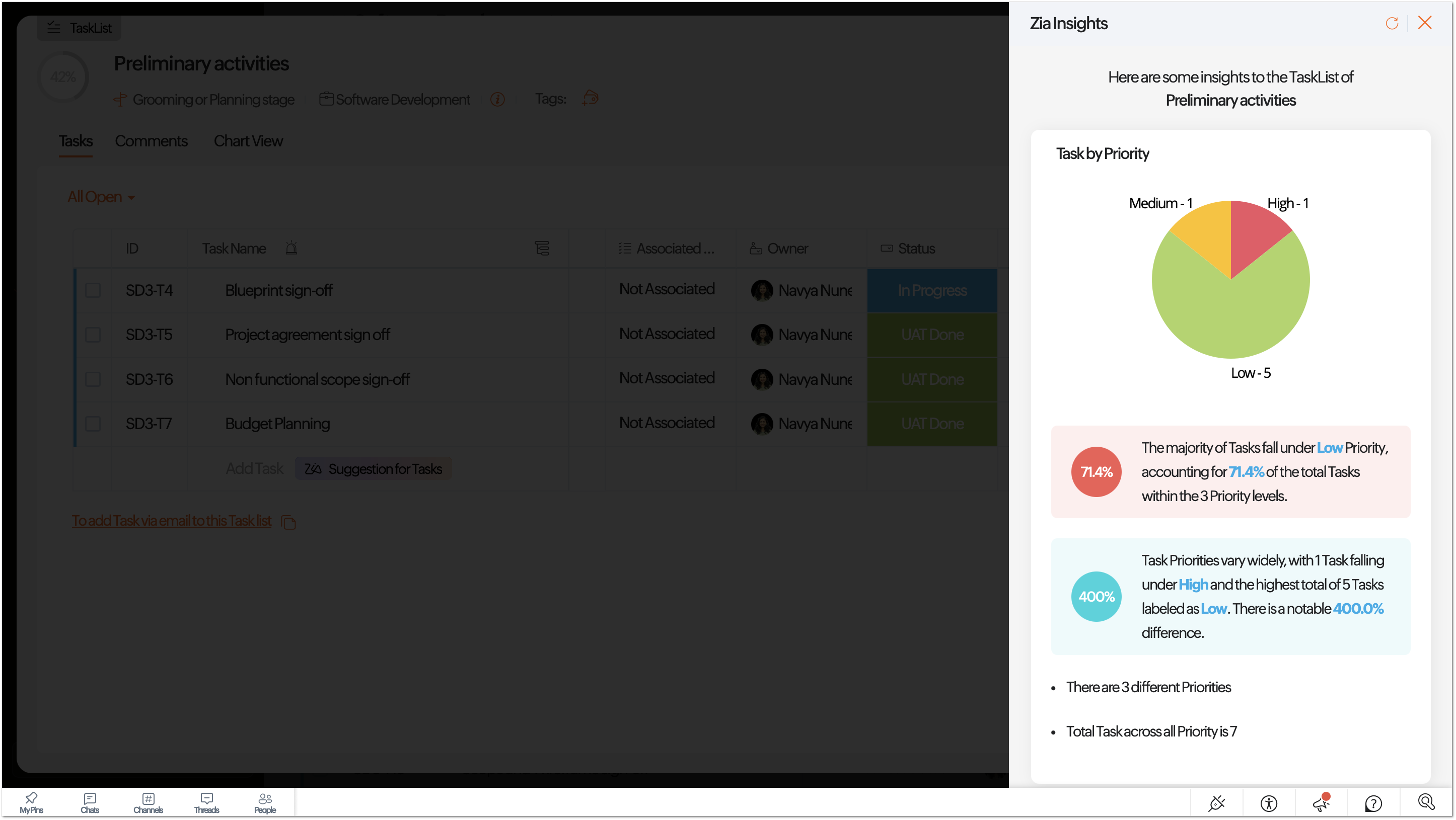 Zia Insights sifts through module data and generates valuable information that can be used to track and improve the efficiency of a project. Users can view Zia insights for tasks, issues and projects from Reports page. They can also view the insights for task list and phases from their respective details page. Managers can examine priority tasks in a task list, task count, status, completion percentage, and more using Zia insights.
