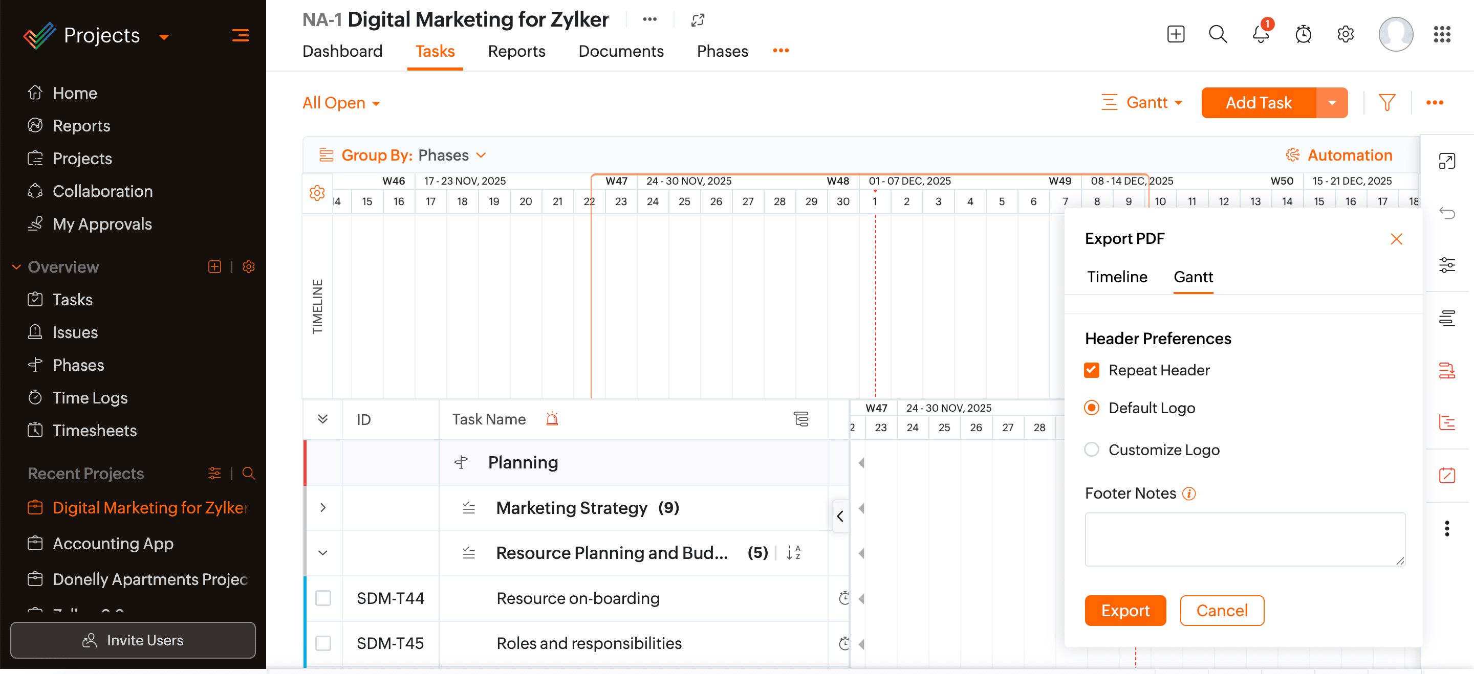 - Click Export to PDF to export the Tasks and its details in PDF.