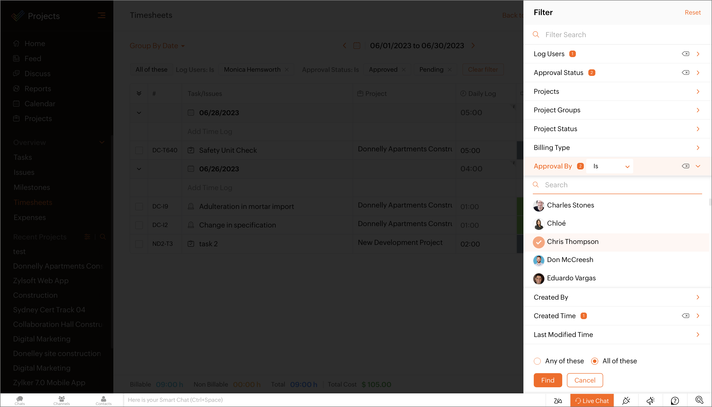 Time logs can be filtered to view time logs matching the selected criteria. Click