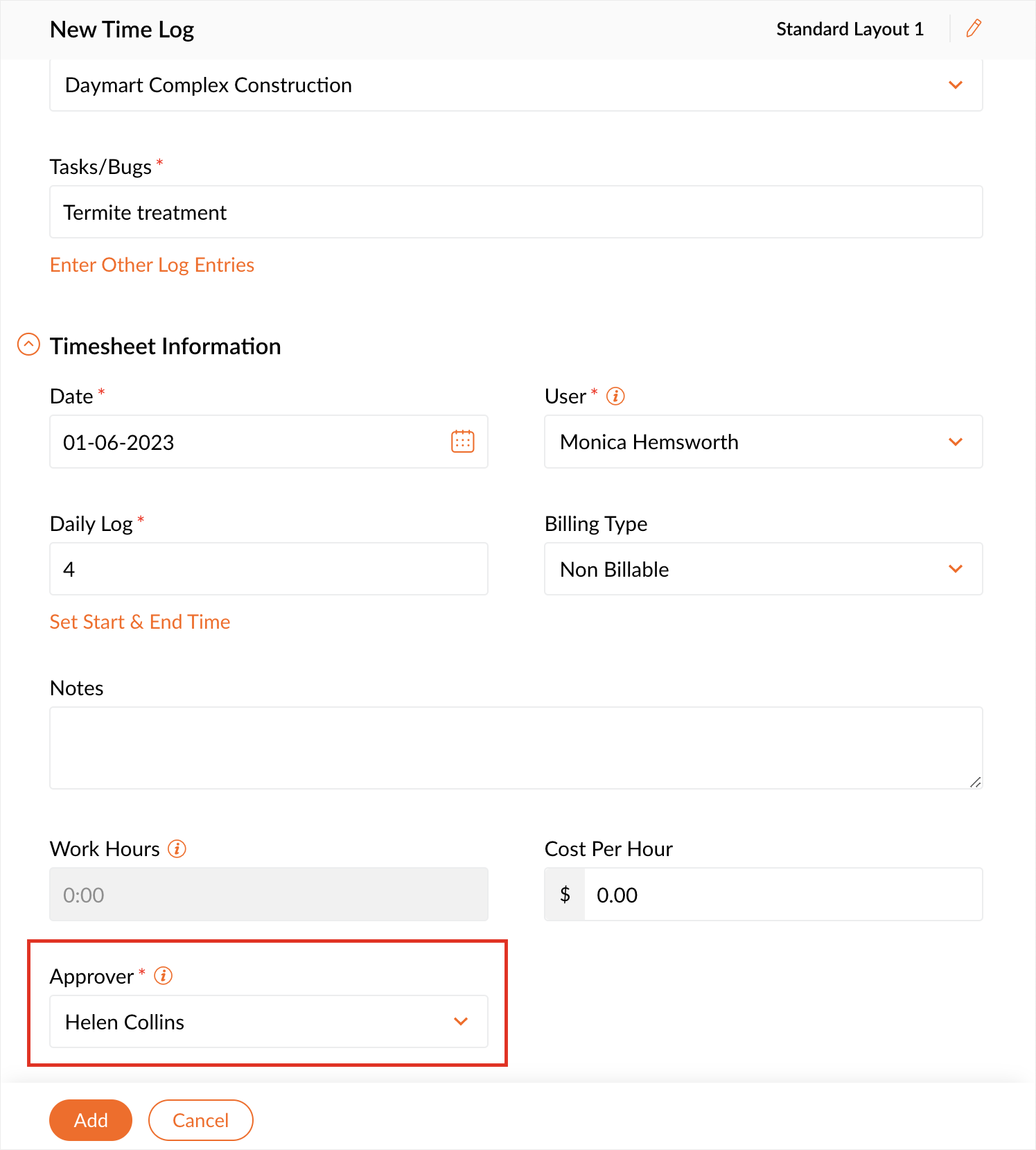 . For all subsequent time log requests, this user will be selected as an Approver by default.