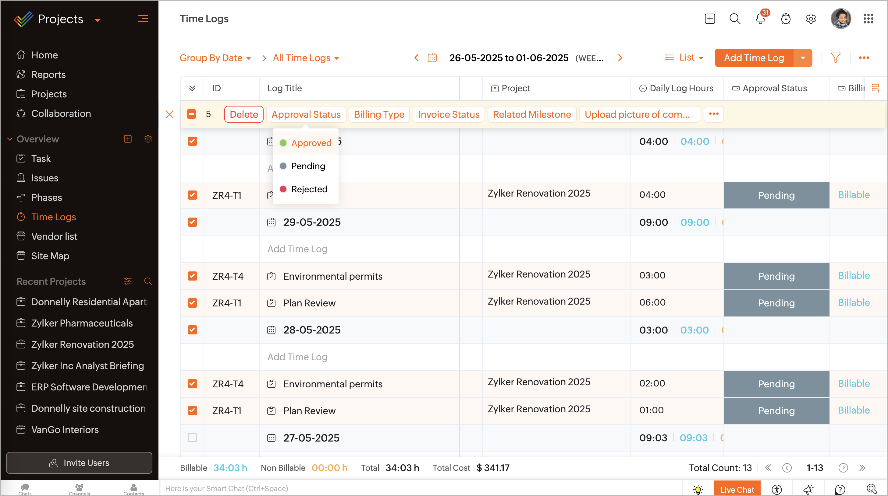 - Time logs can be approved in bulk too. Select one or more records and click Approval Status in the bulk update options . Select the required status.