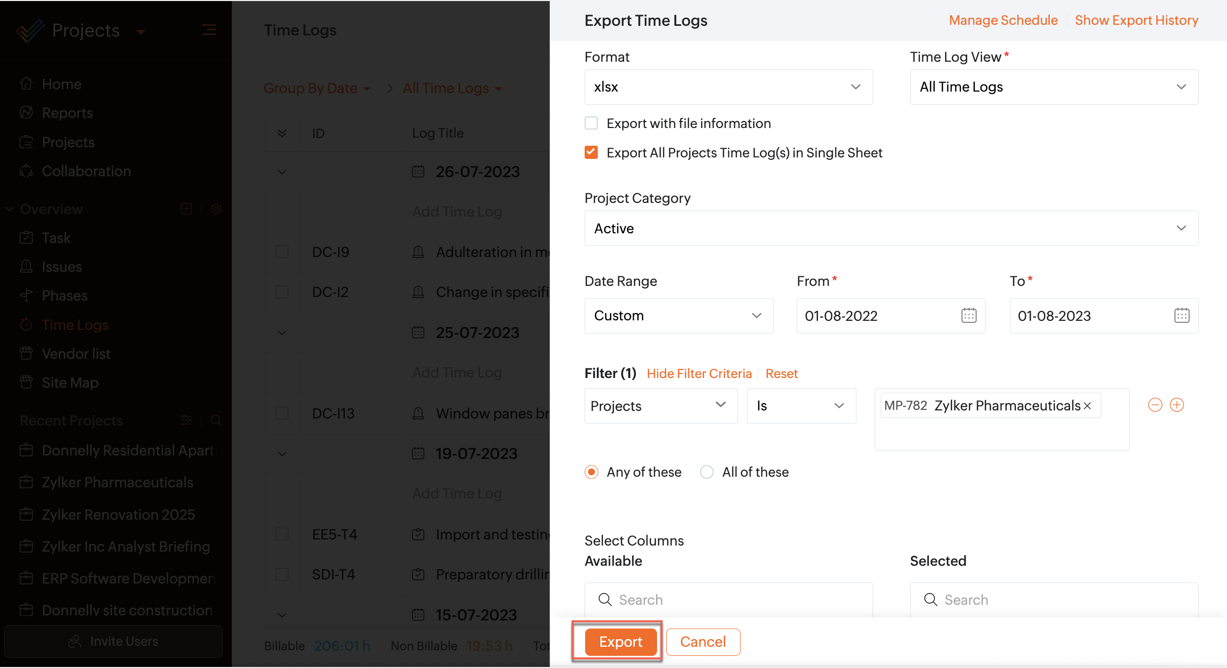 Export Time Logs for All Projects | Online Help | Zoho Projects