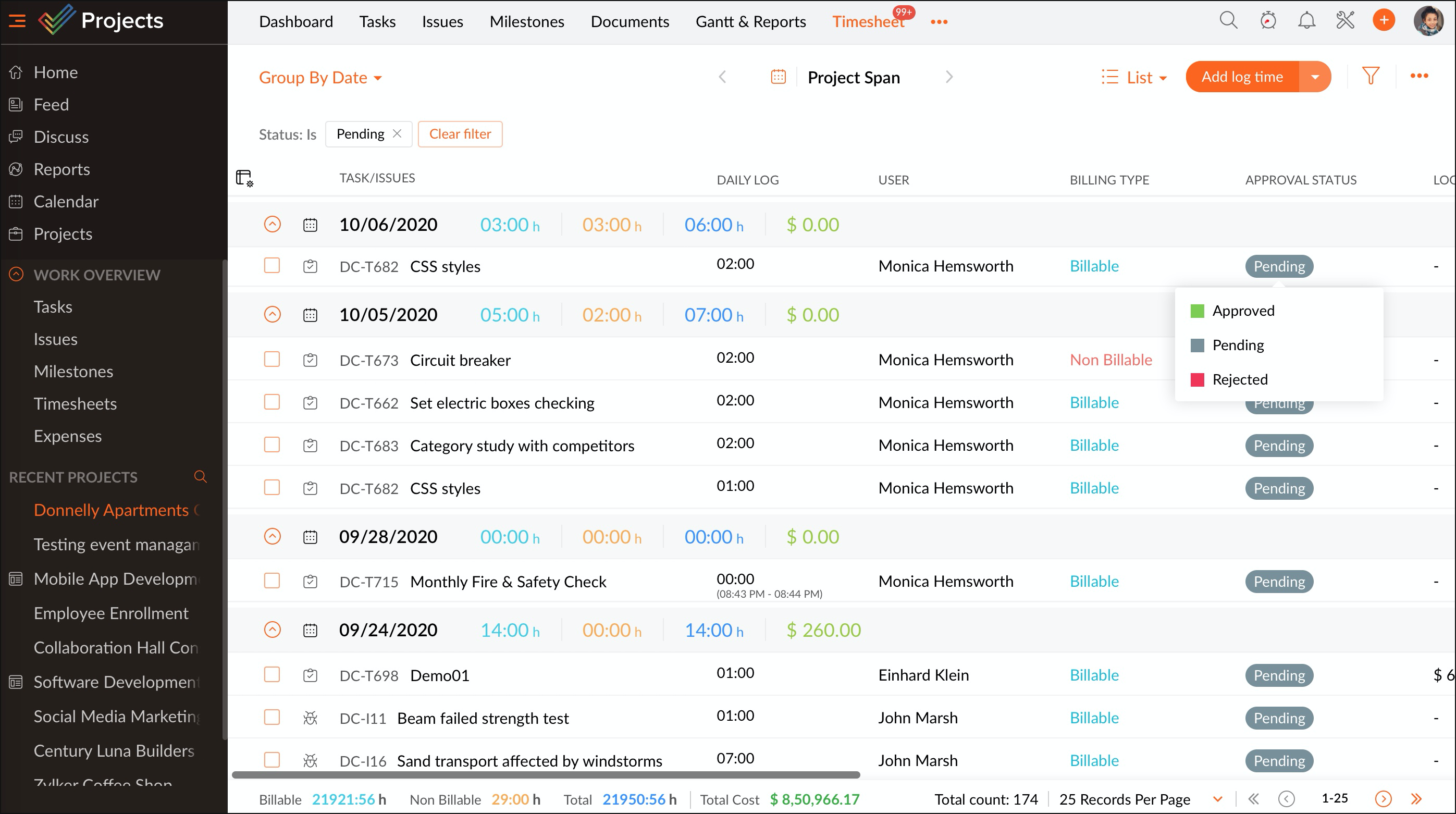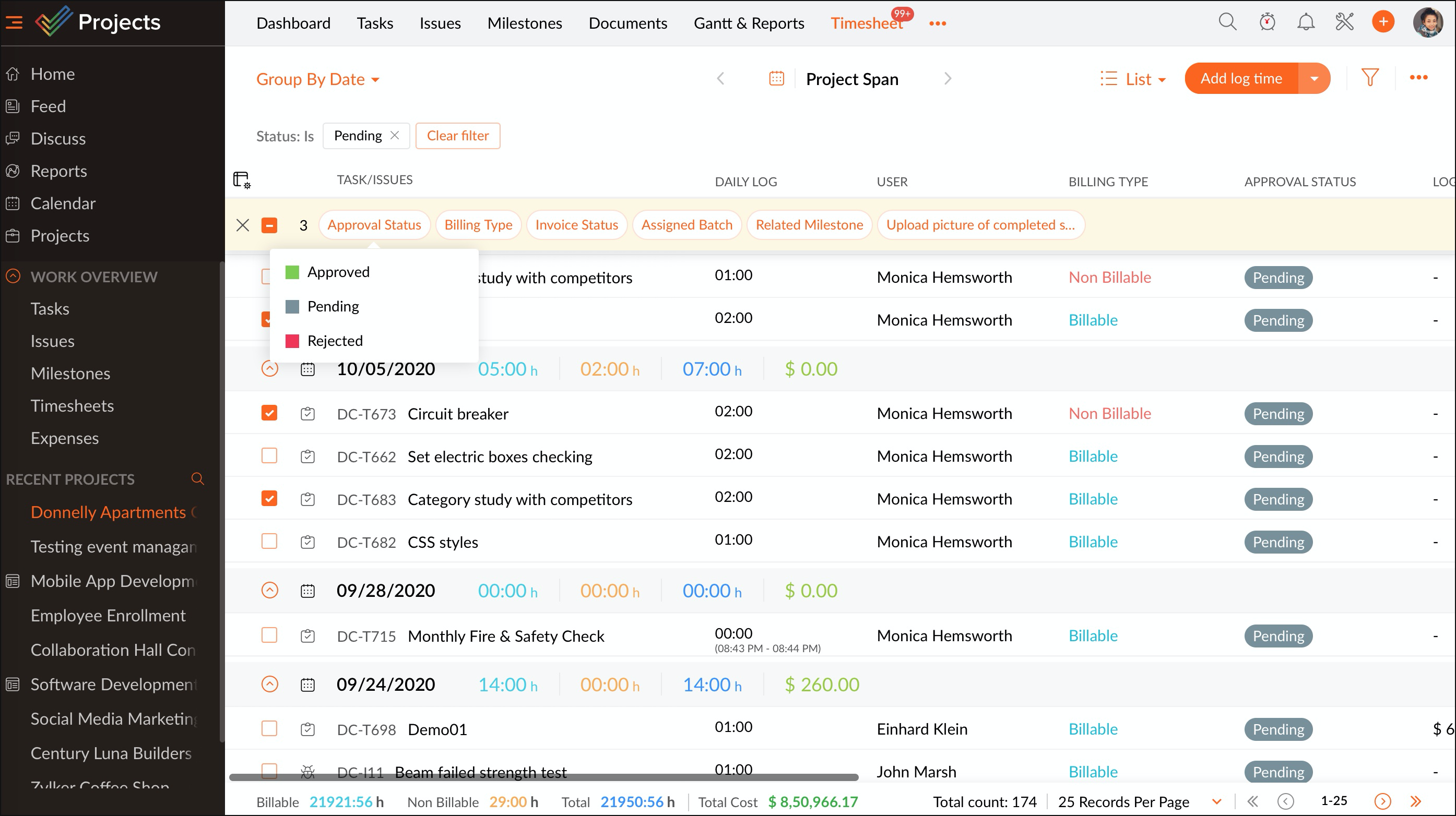 If timesheet approval setting is enabled you can approve timesheets before they are billed.