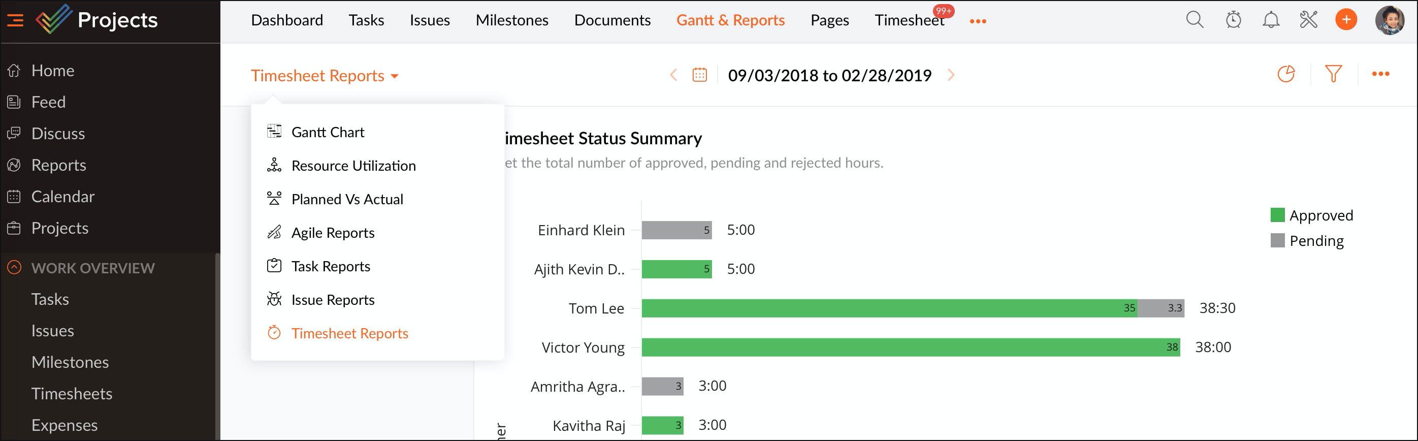 Timesheet reports help you track the hours logged for tasks and issues. The Advanced Reports show the approved, rejected, and pending hours logged by each user. Billable and Non-billable Timesheet report shows how many hours are billable and non-billable by user.