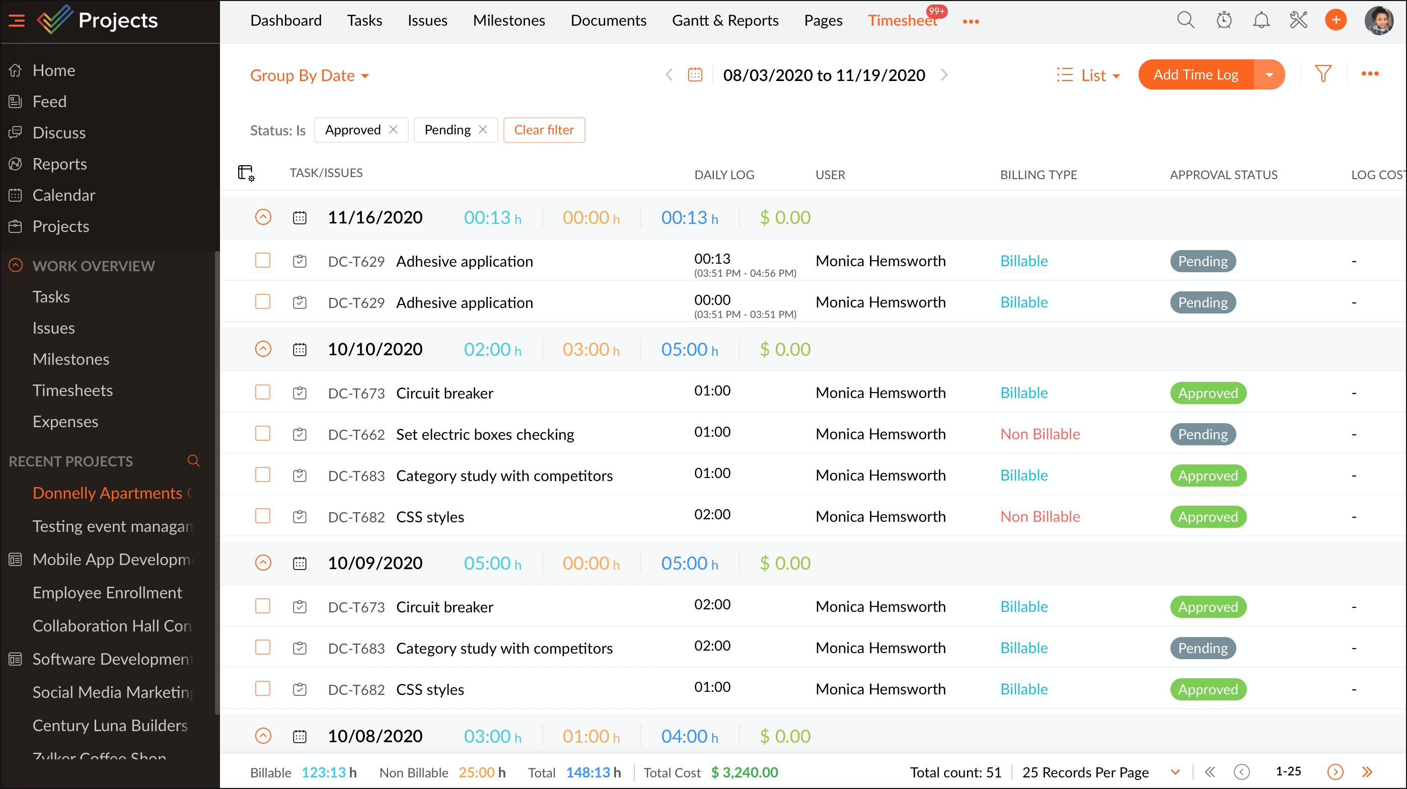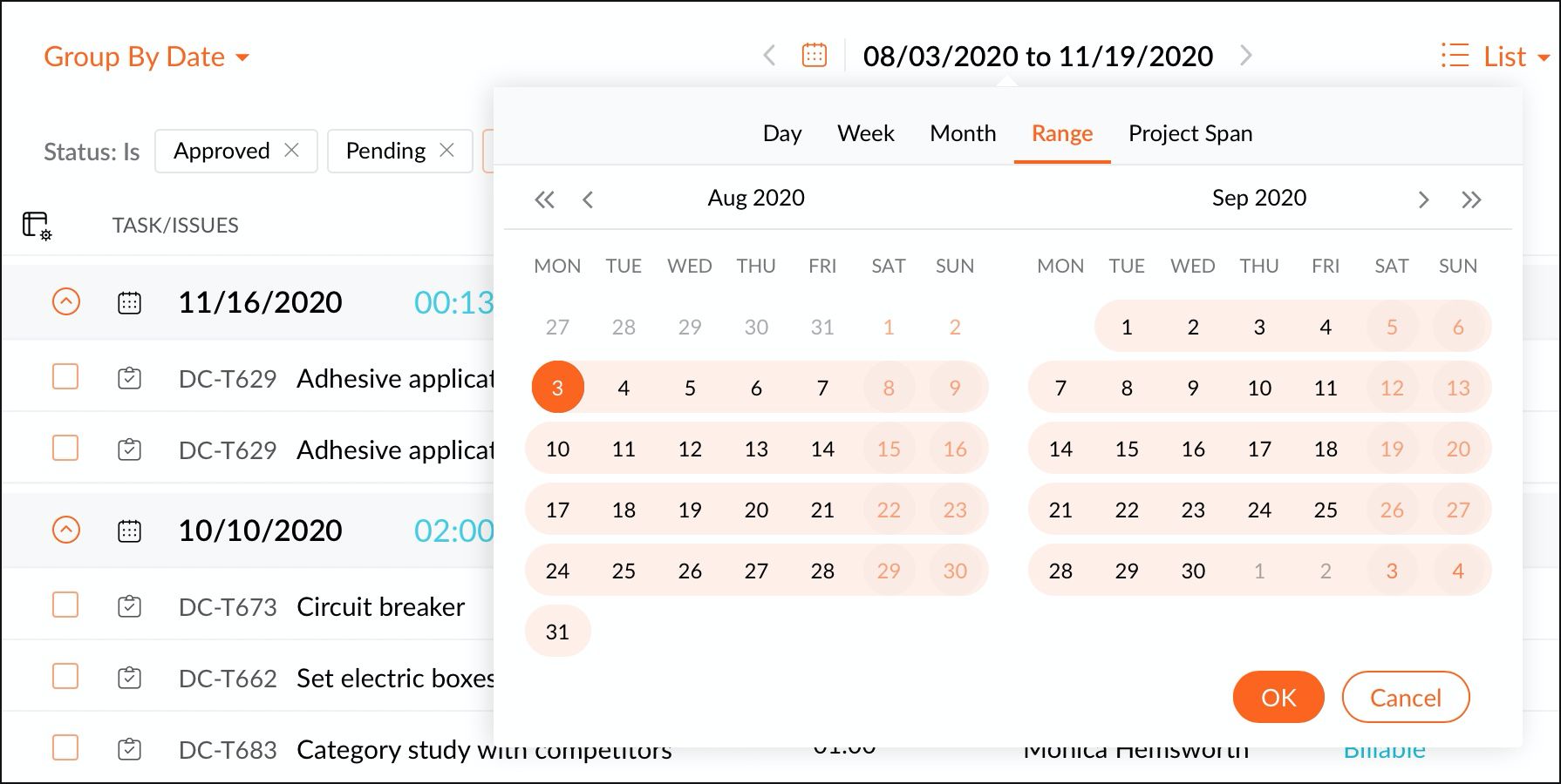 List view displays the time logs for tasks and issues by day for the selected time period. The list view also shows details such as billing type, approval status, user name etc. The view also displays any custom fields added to the associated timesheet layout.