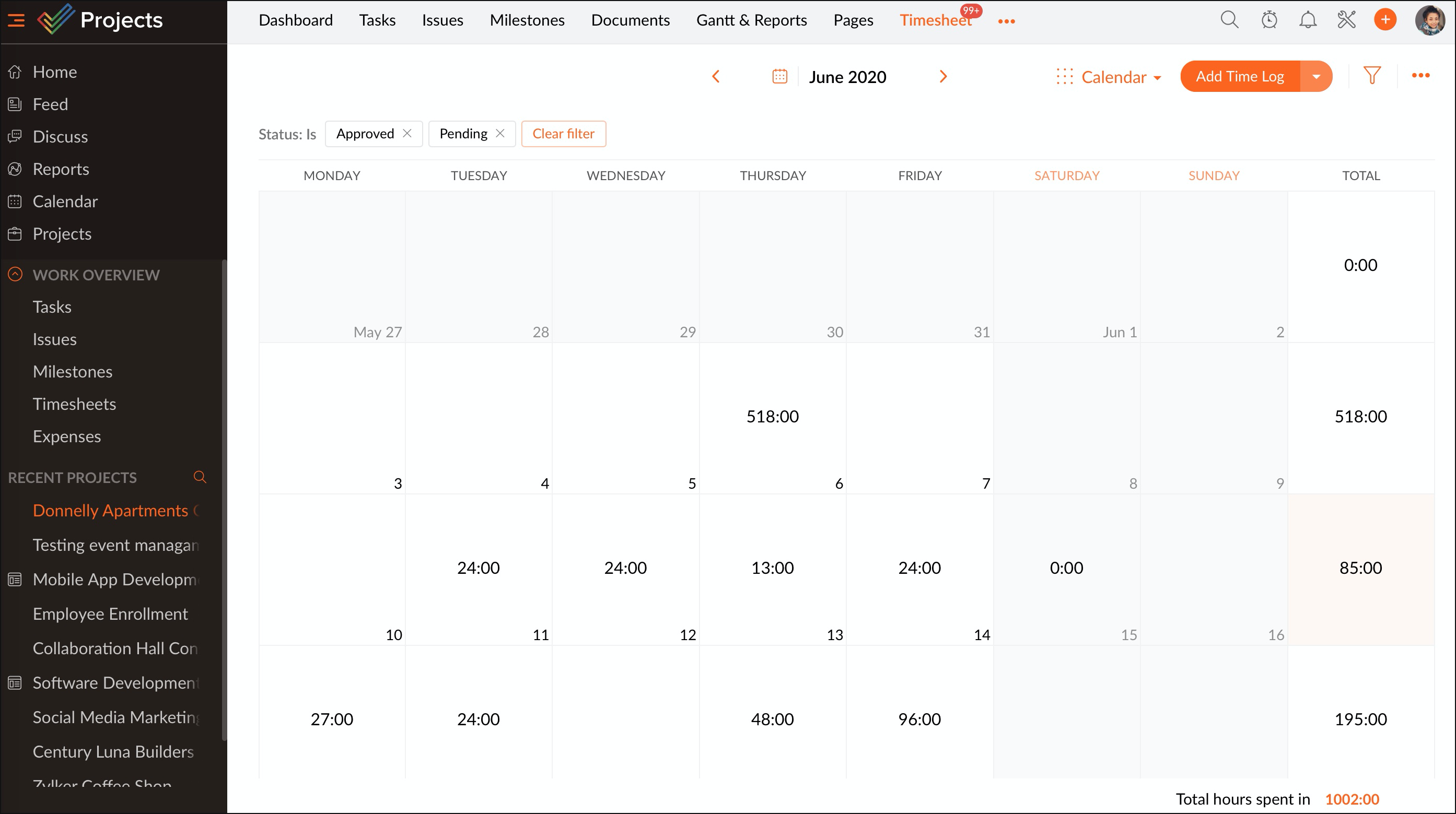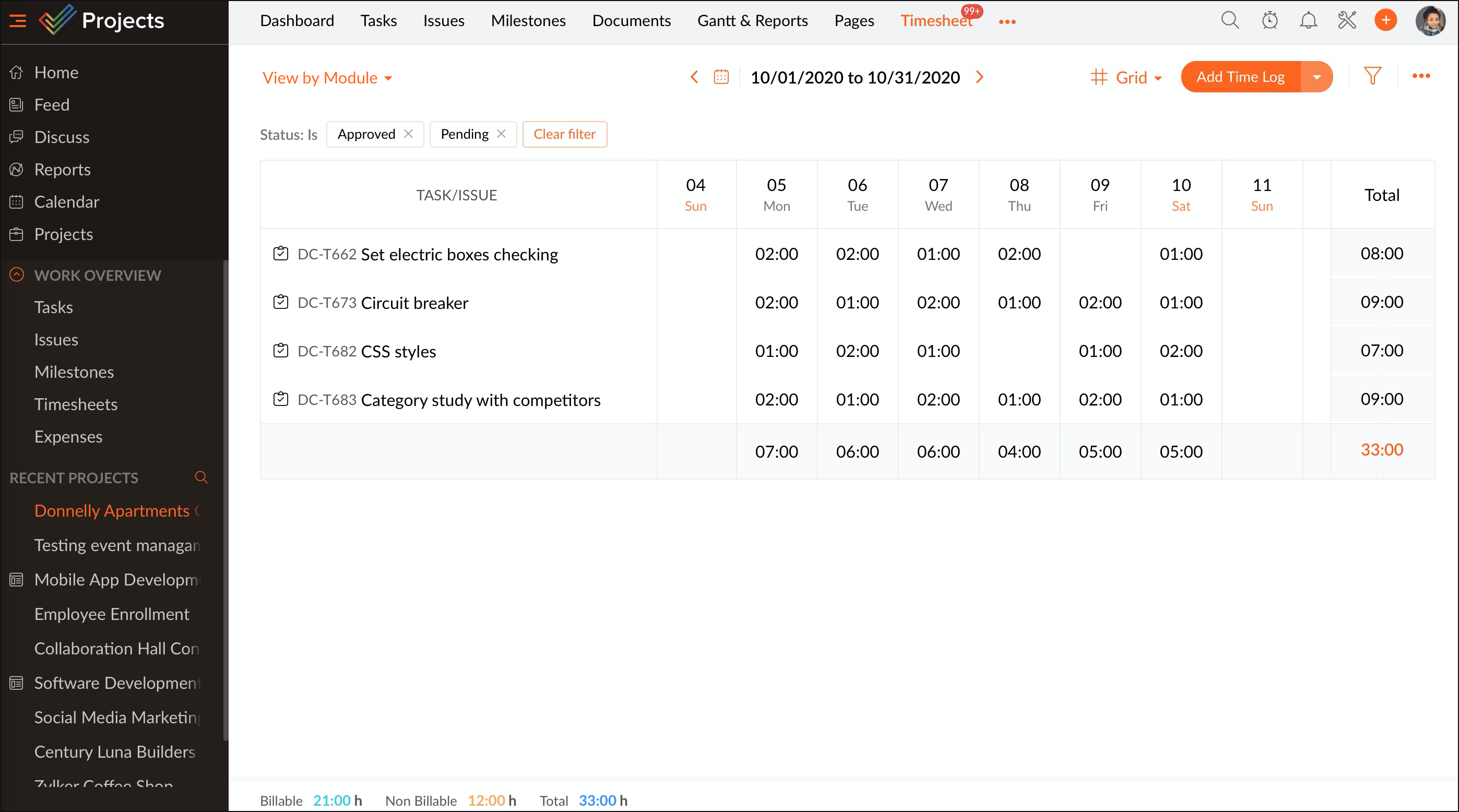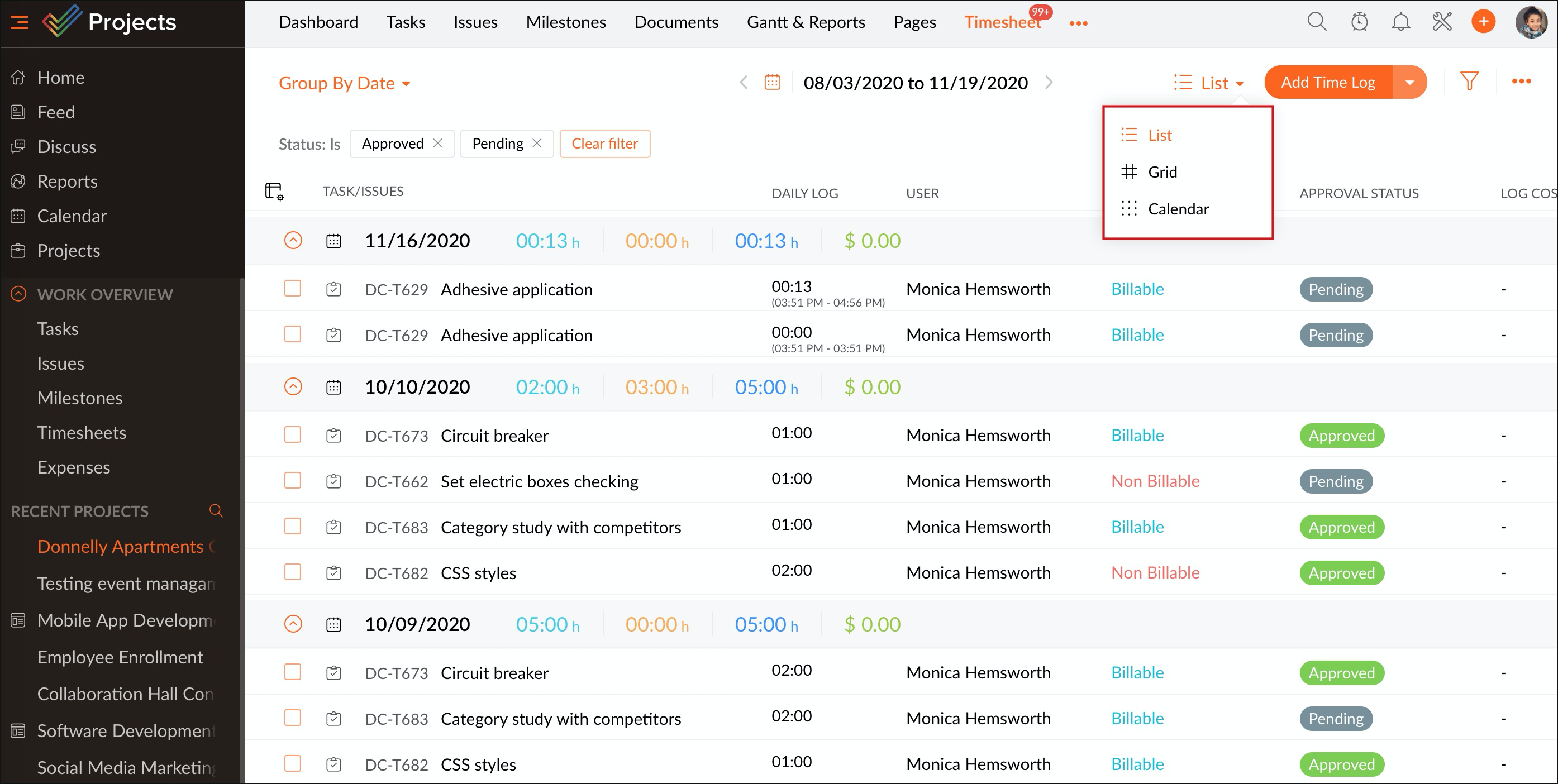 Zoho Projects Timesheet module supports 3 types of views. List, Grid, and Calendar. These views are accessible from the global Timesheets under Work Overview and the Timesheet module under individual projects.