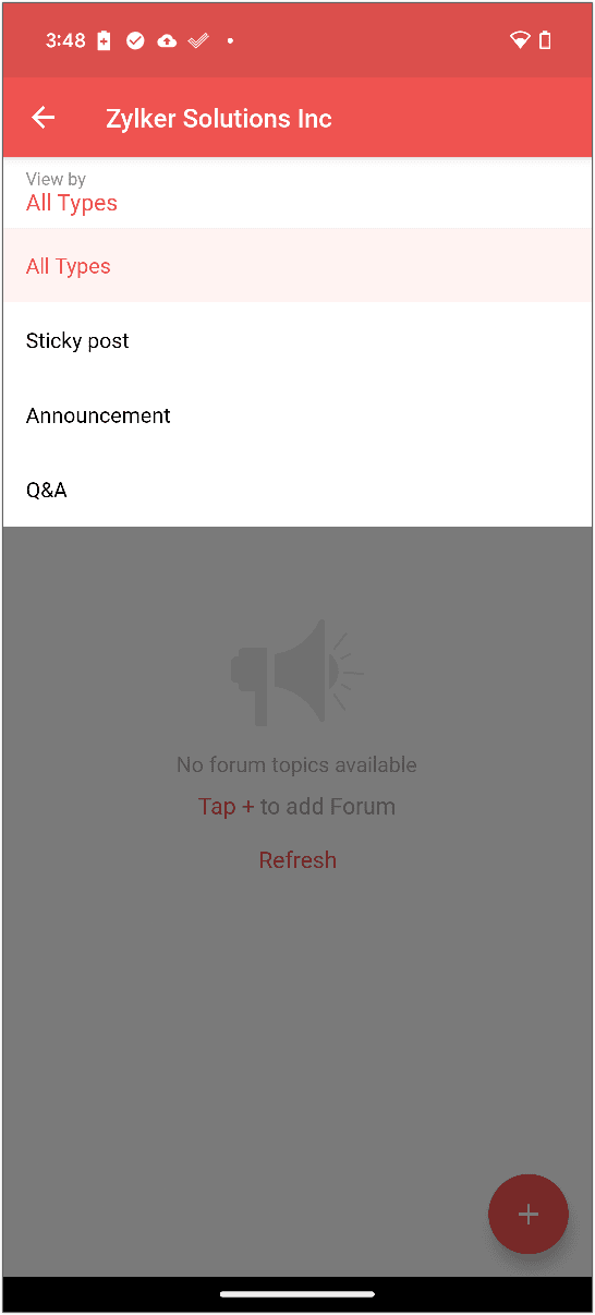 Forums list view Add Forum Click the icon at the top-right corner. Enter the forum information. Click Save. View Forums You can view the forums based on type by selecting a specific view under the View by option. Select All Types if you need to view ...