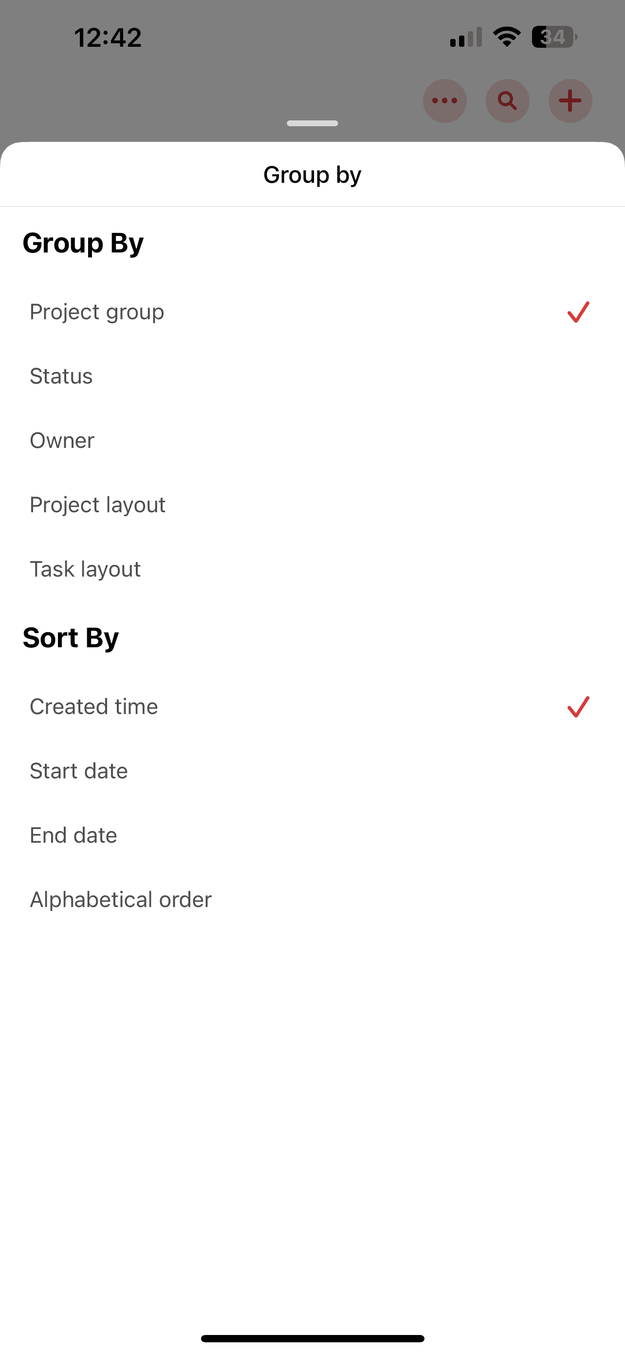 Customize the list view by grouping and sorting projects based on your requirement. Grouping will take precedence over sorting. First, the projects will be grouped based on the selection; then, they'll be sorted within the group as per the selected criteria.