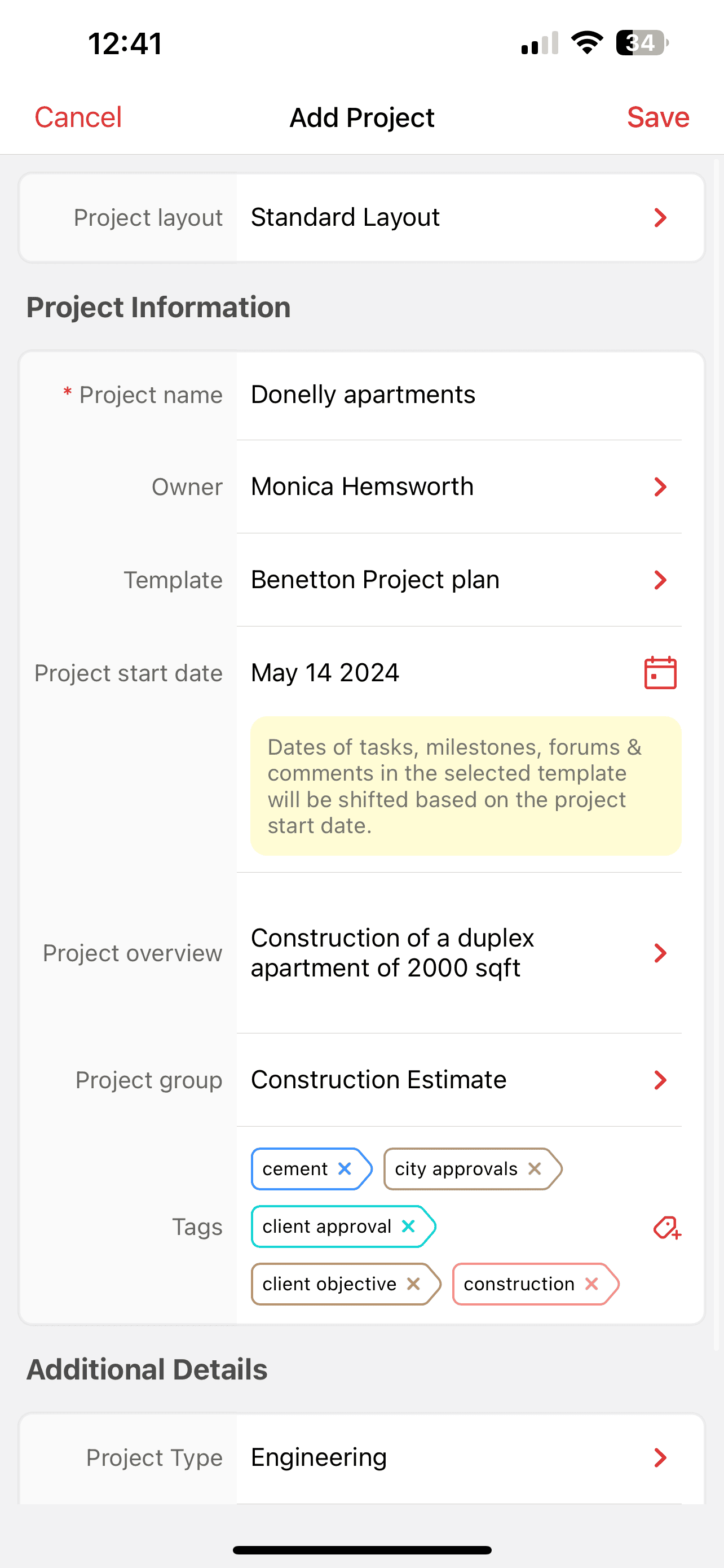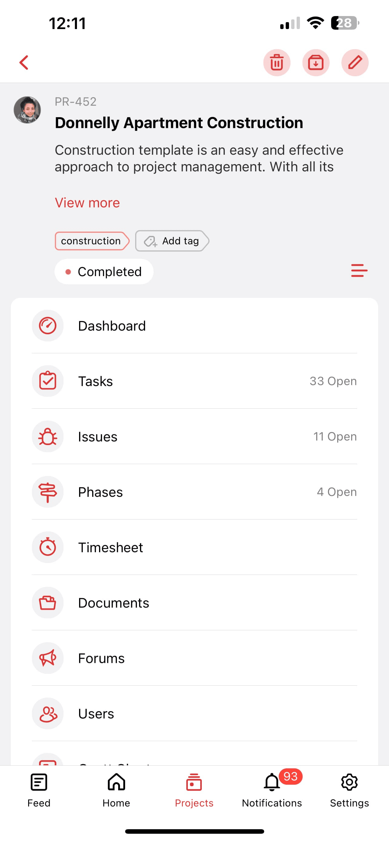 On opening a project in the mobile app, details of the project will be displayed in the card view. The card view contains: