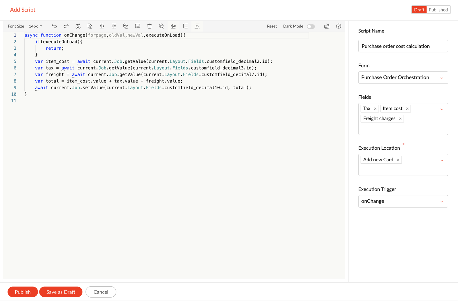 - onChange- Select this option to execute the script when a page is updated. On selecting this, a Field dropdown is displayed in the right panel, where you can choose the fields whose update must trigger the script.
