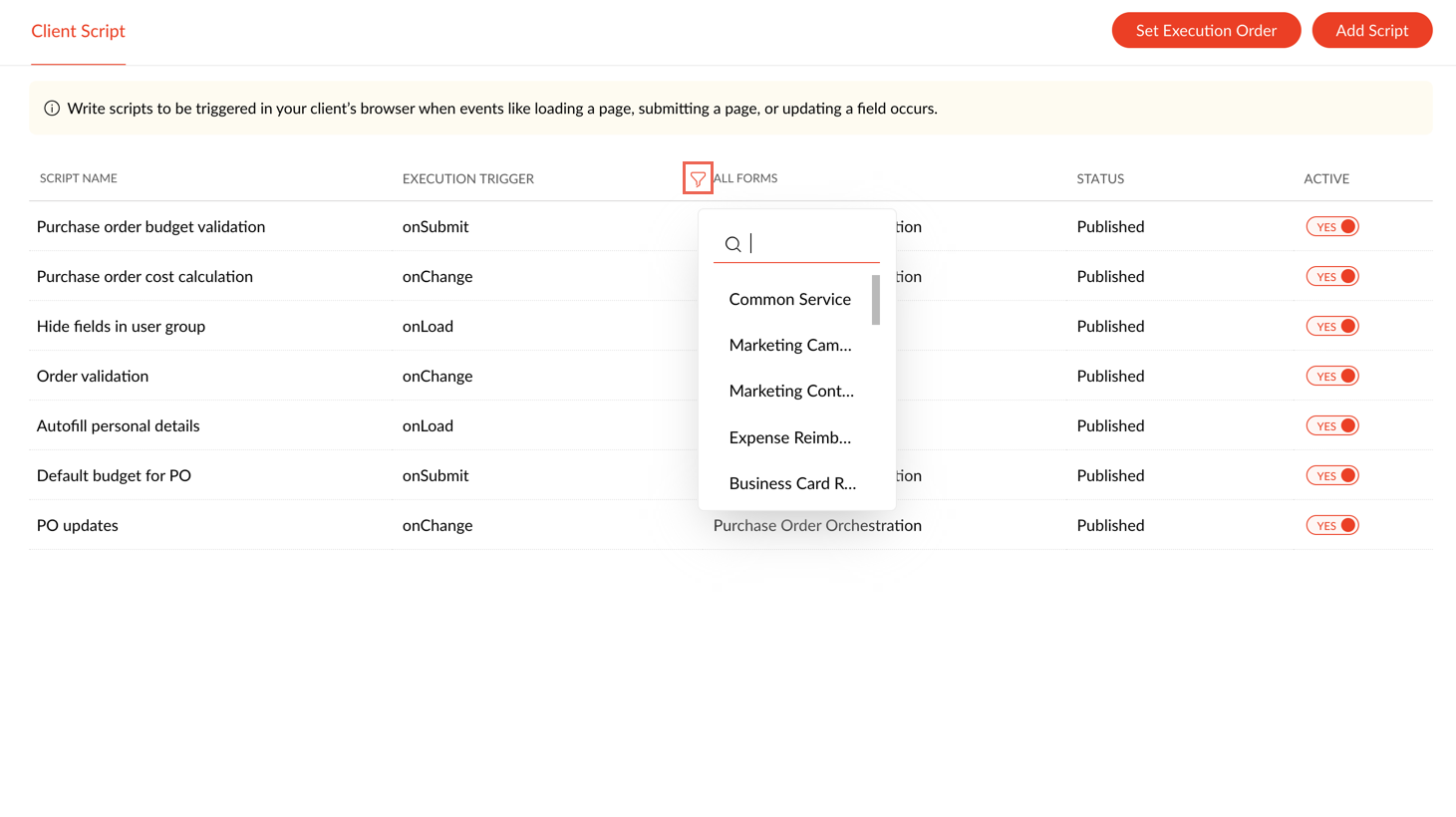 Client scripts can be filtered and viewed based on Forms. To filter scripts,