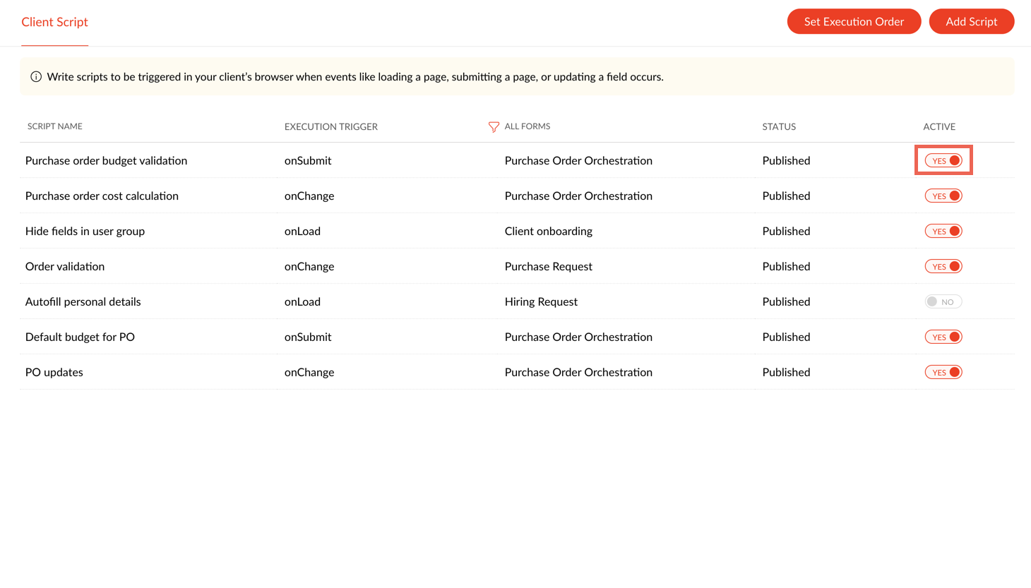 All published client scripts will be enabled by default. However, scripts can also be disabled to stop its execution temporarily.