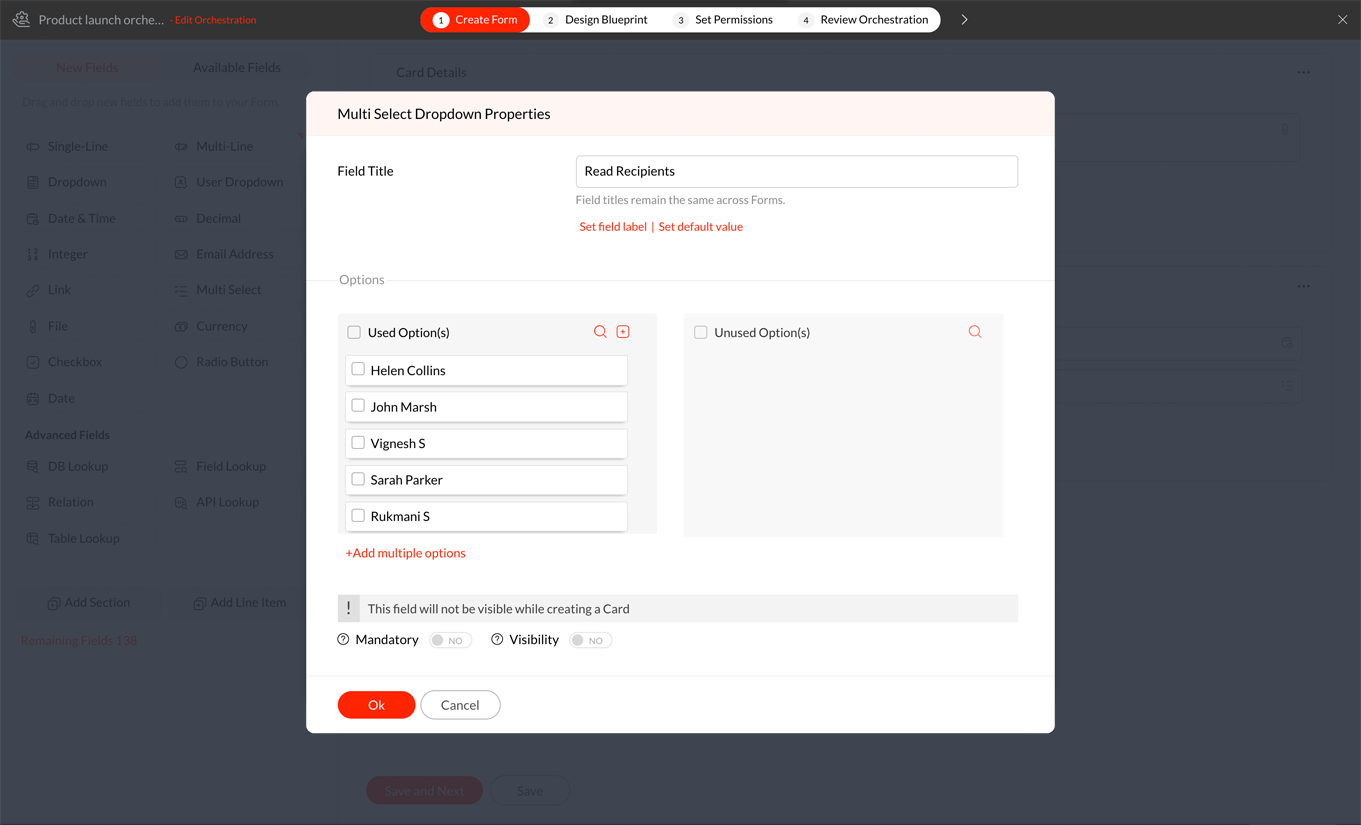 1. Create a multi select field-- Read Recipients --in the form with different user names as options.