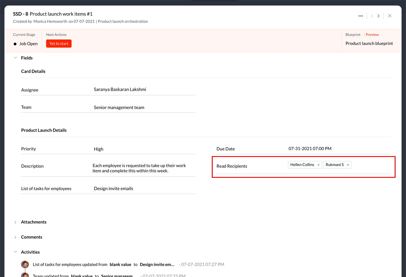3. Create a card and add the work that has to be taken up for the product launch and track the users who have viewed the card using the Read Recipients field.