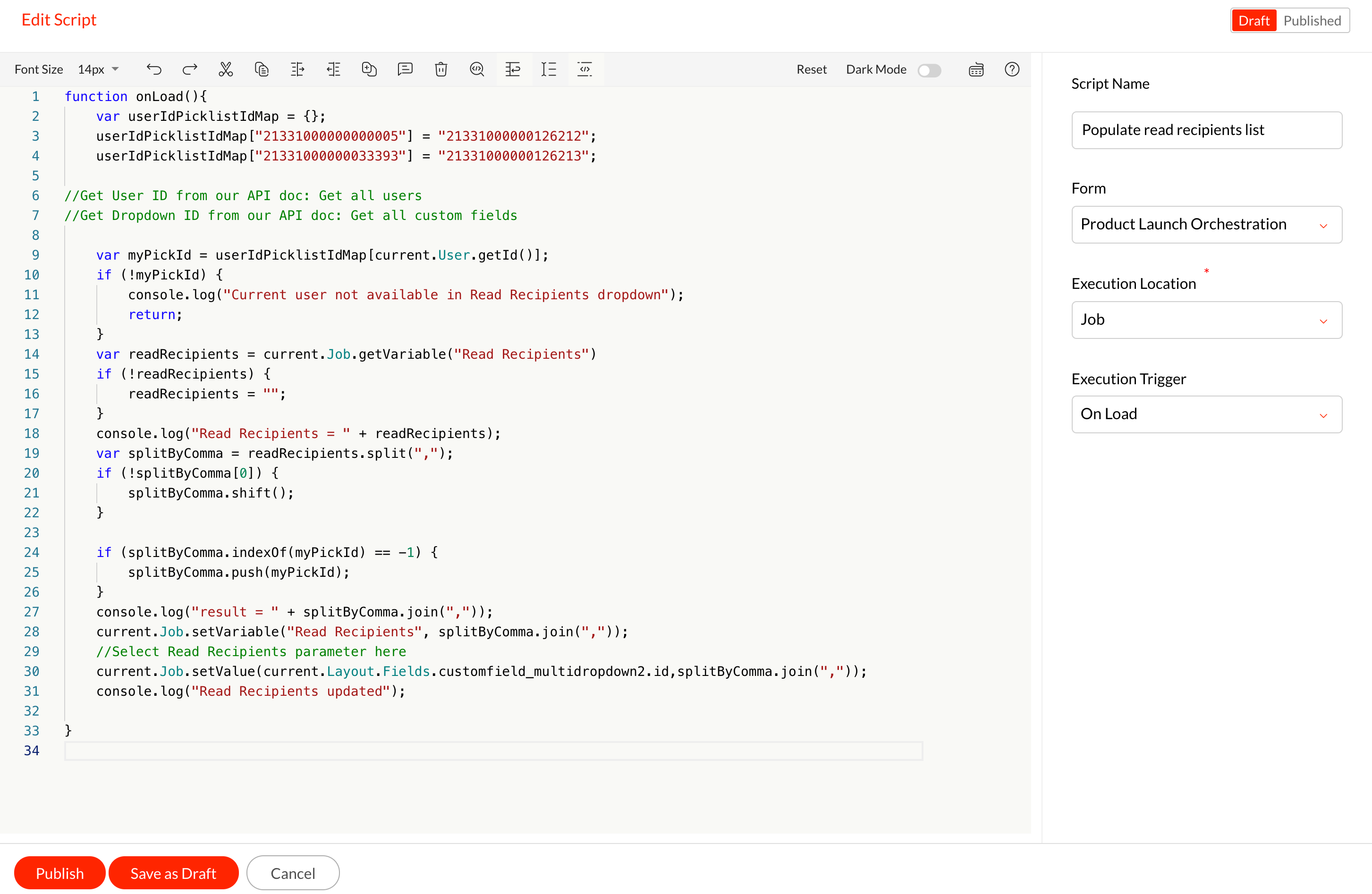 Qntrl | Online Help | Business case 1: Populate read recipients list for a card using Server Scripts (On Load)