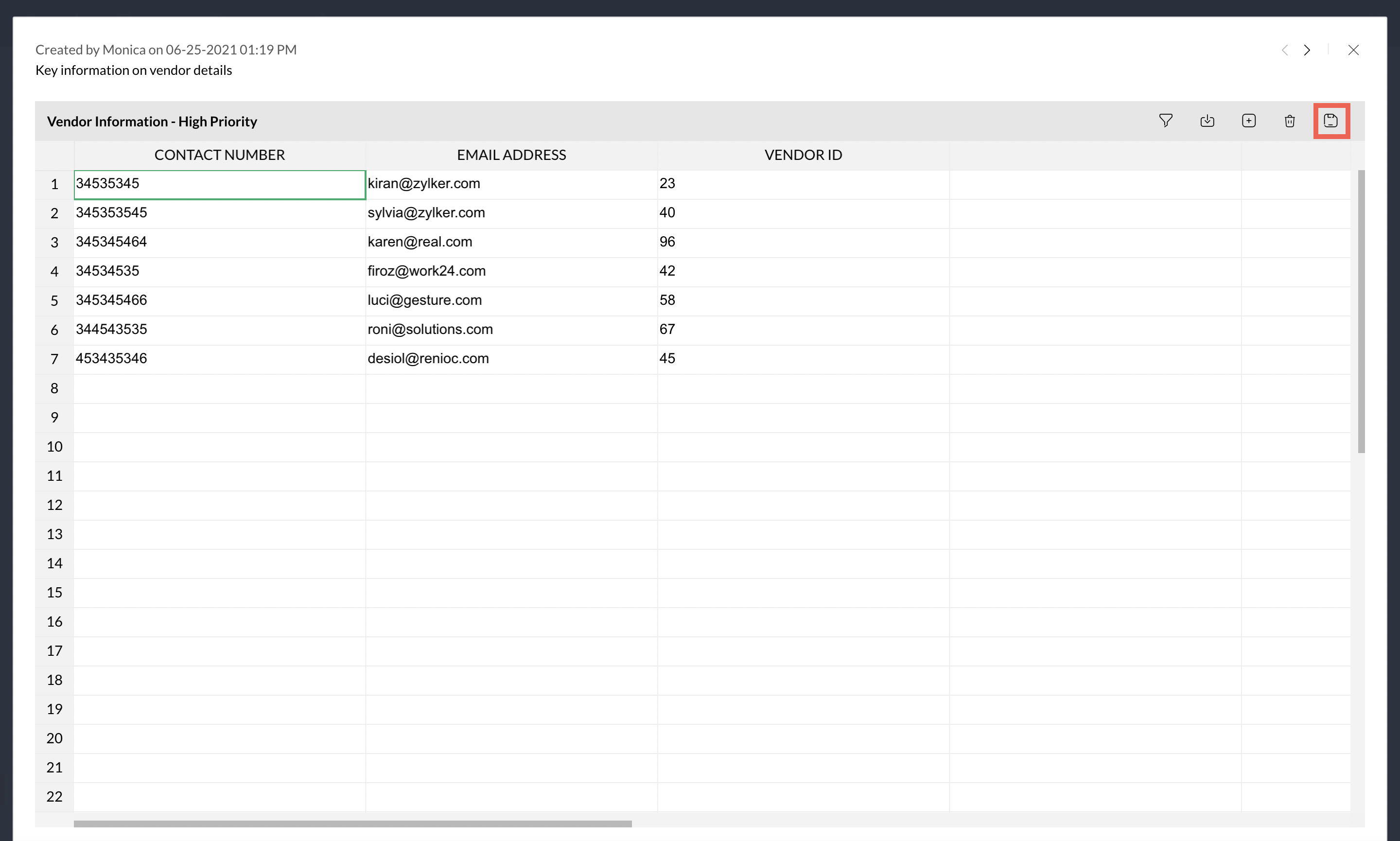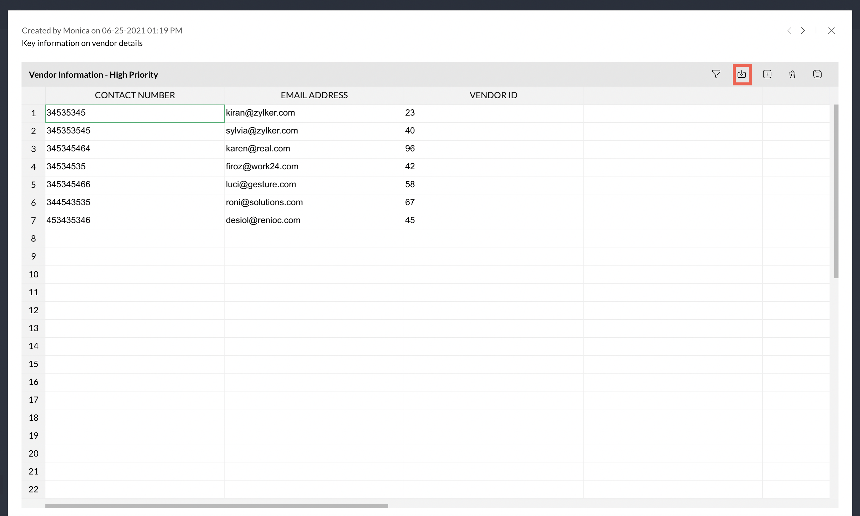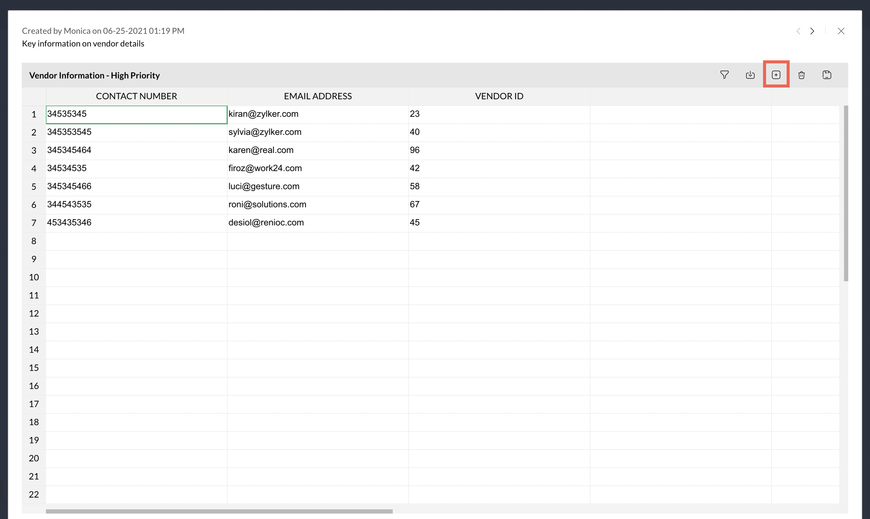 For example, Zylker-- a manufacturing company, buys required materials from vendors to manufacture cement. Zylker stores the contact numbers and other referential data of the vendors they frequently deal with in external sheets. This information can be digitized and saved in Qntrl 's tables for ease of updates and central access.
