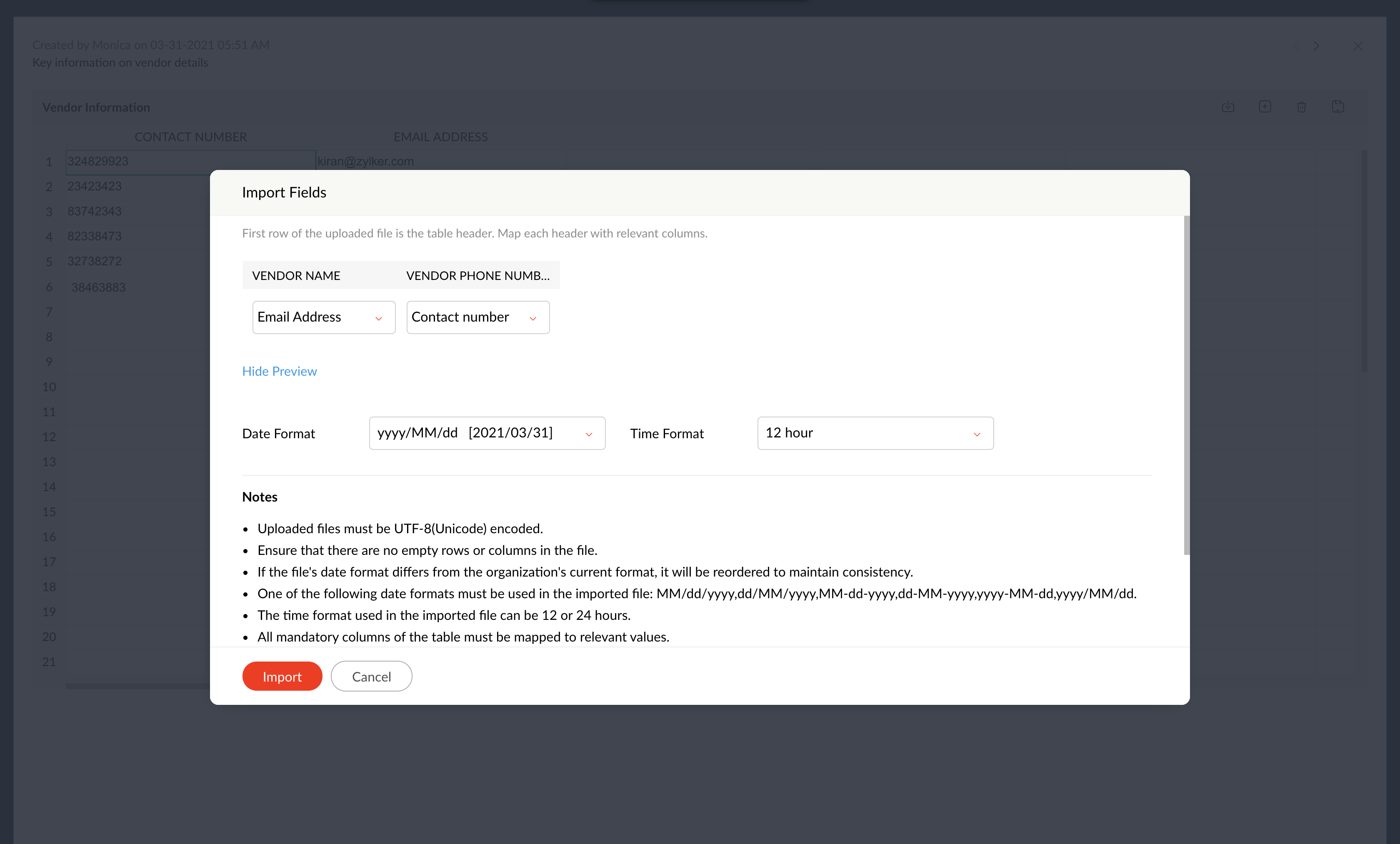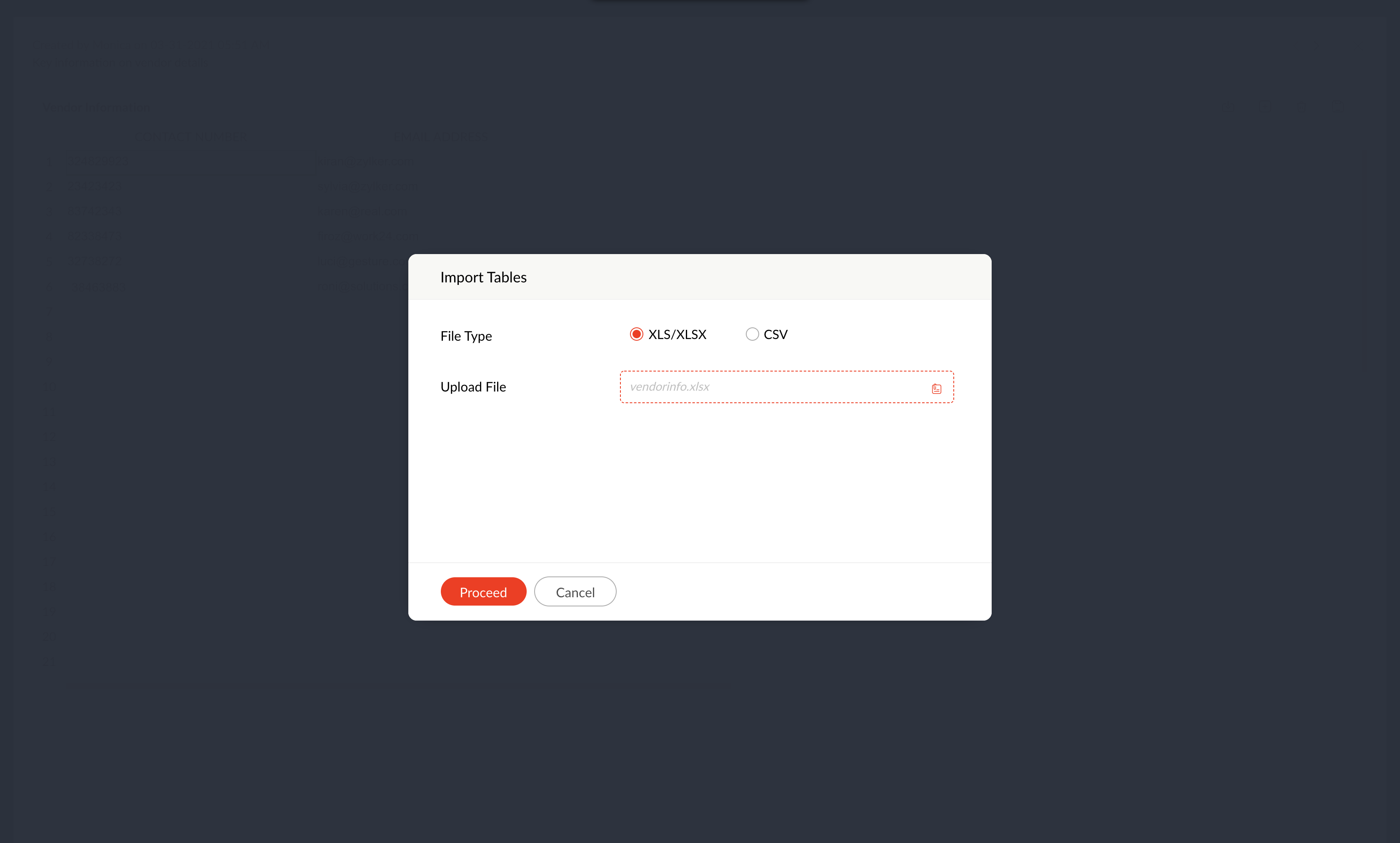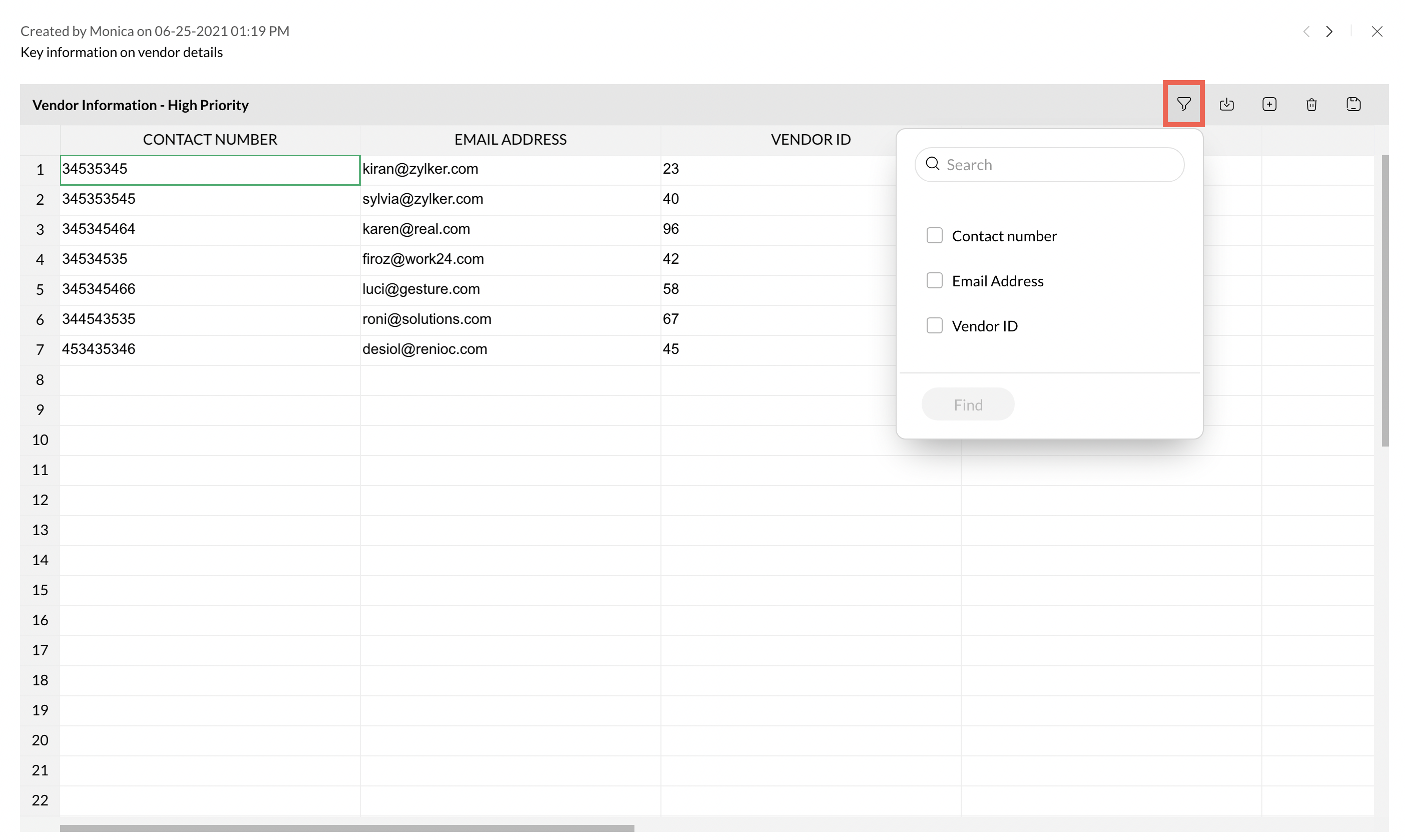 For example, Zylker-- a manufacturing company, buys required materials from vendors to manufacture cement. Zylker stores the contact numbers and other referential data of the vendors they frequently deal with in external sheets. This information can be digitized and saved in Qntrl 's tables for ease of updates and central access.