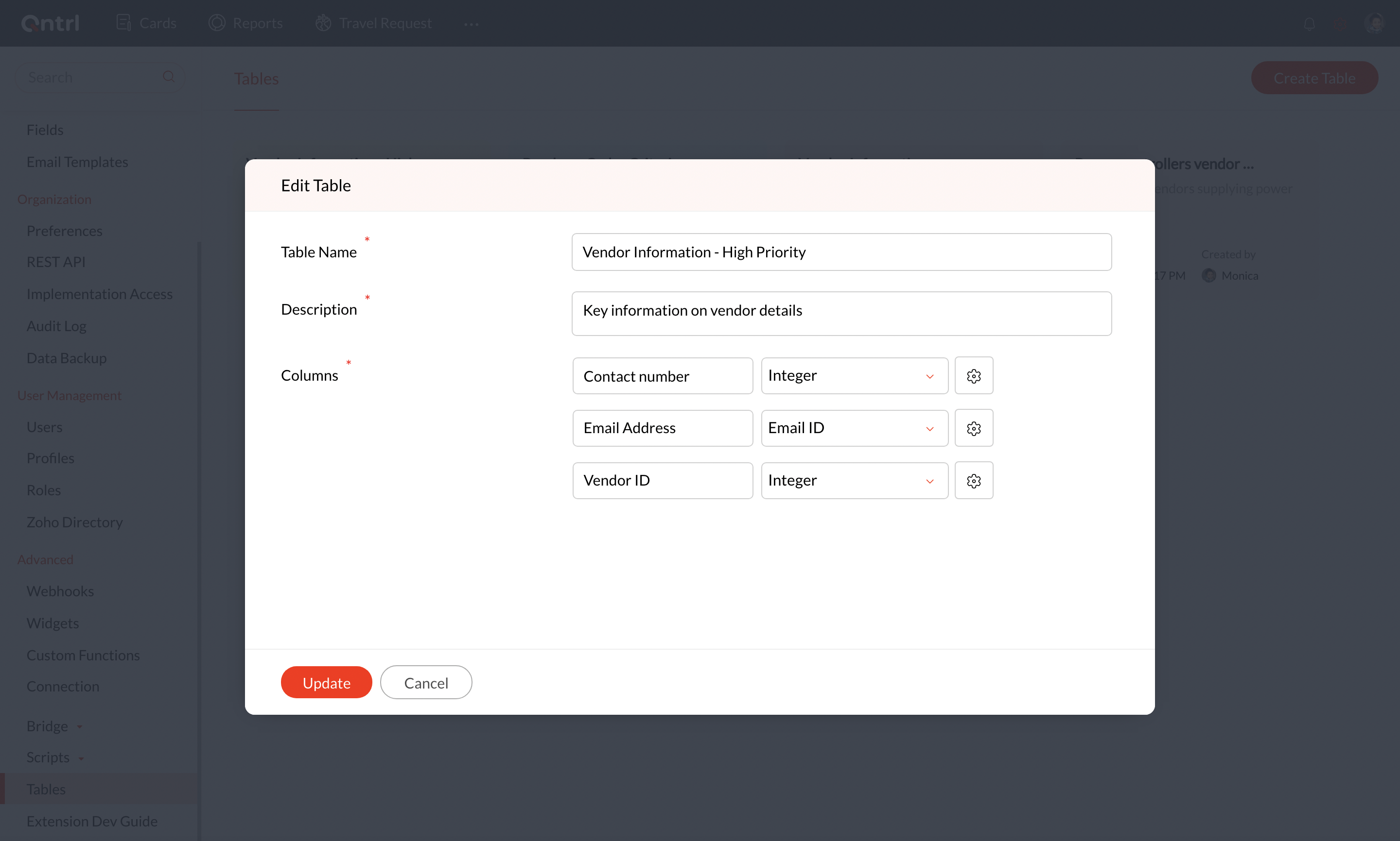 Tables help you store reference data in a tabular format within Qntrl . You can store data vital to support your business processes here. Also, the data in tables can be listed in cards using Table Lookup .