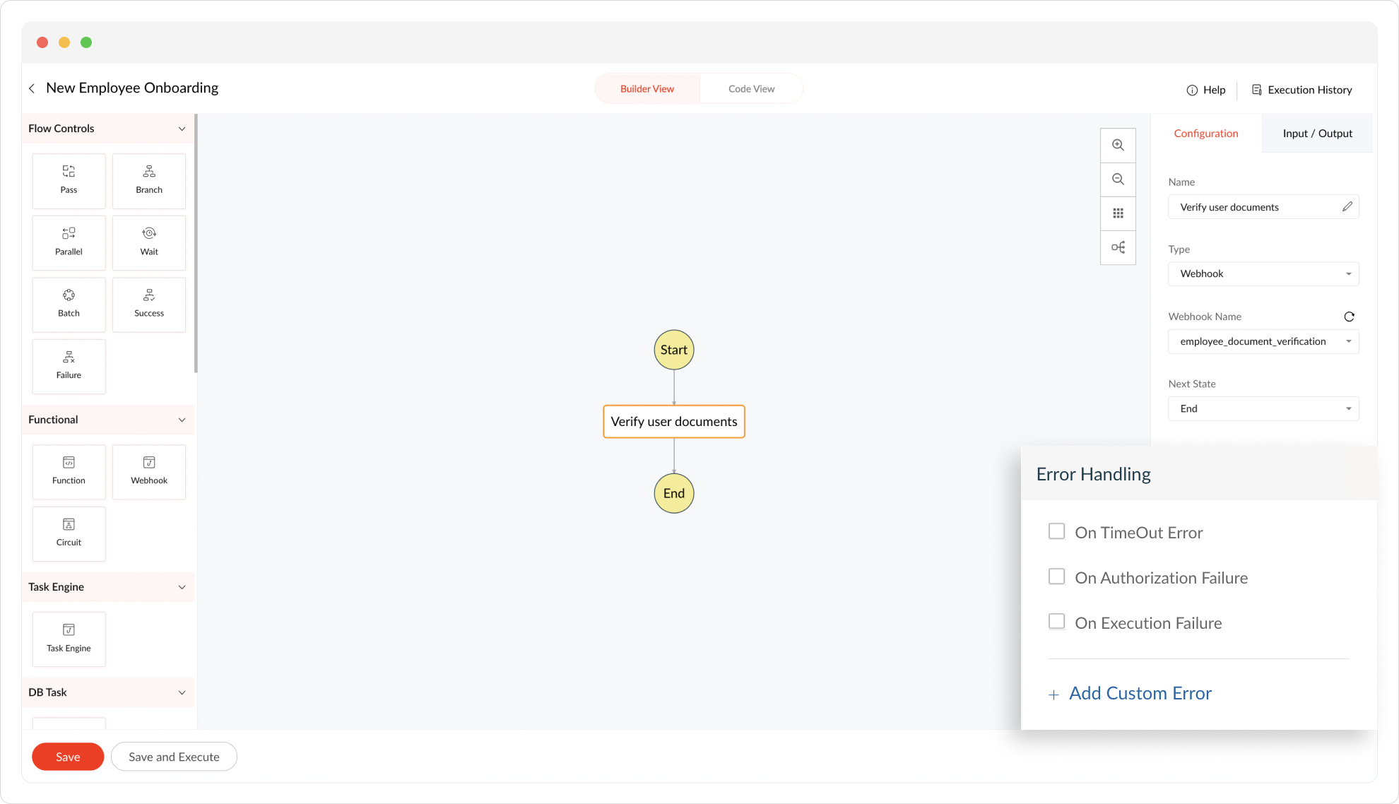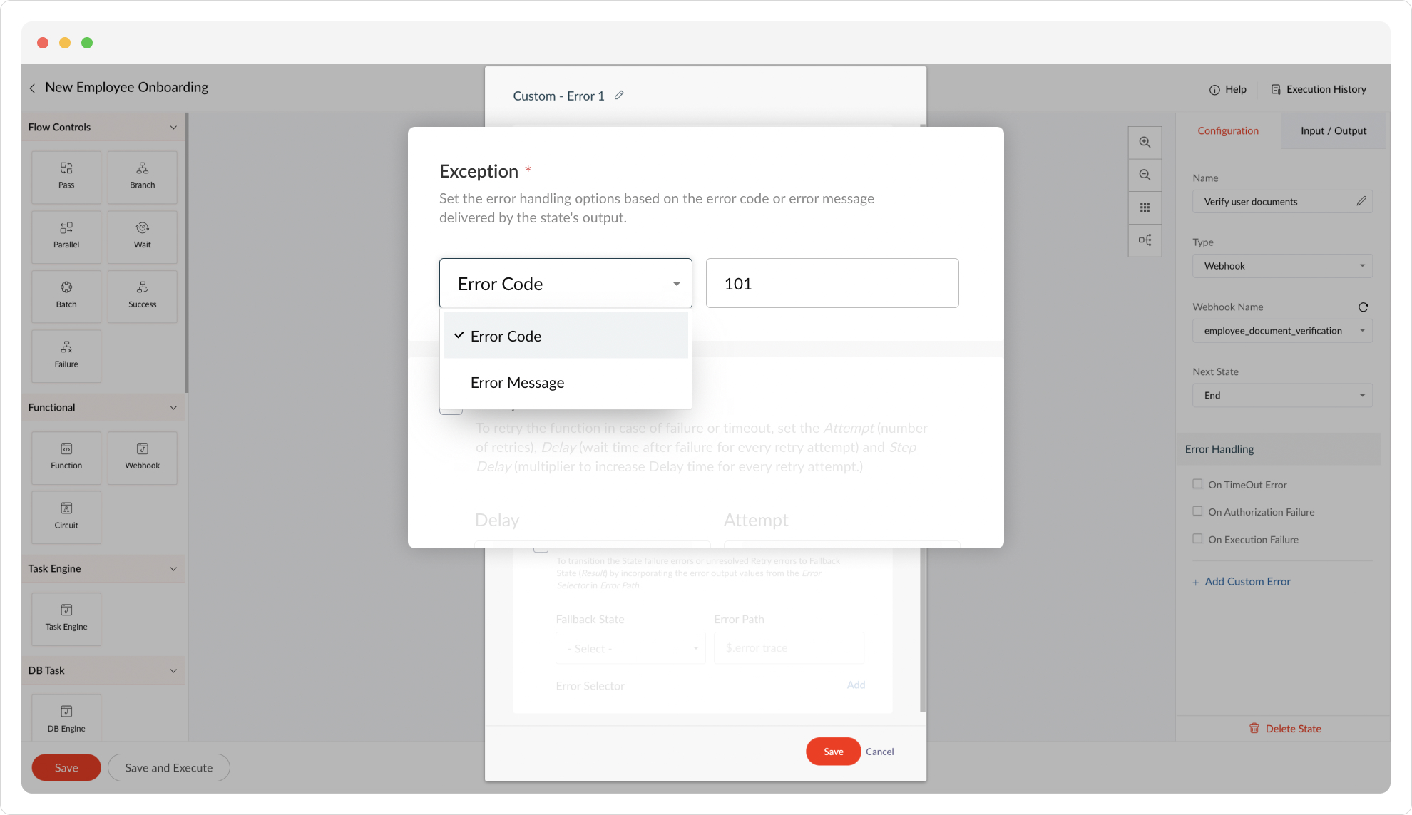 Only Functional states, such as Function, Webhook, and Circuit, are bound to have runtime errors, so the error handling feature is only supported for functional states. When you add a Functional state (Function, Webhook, or Circuit), the Error Handling option appears under Configuration on the right panel.