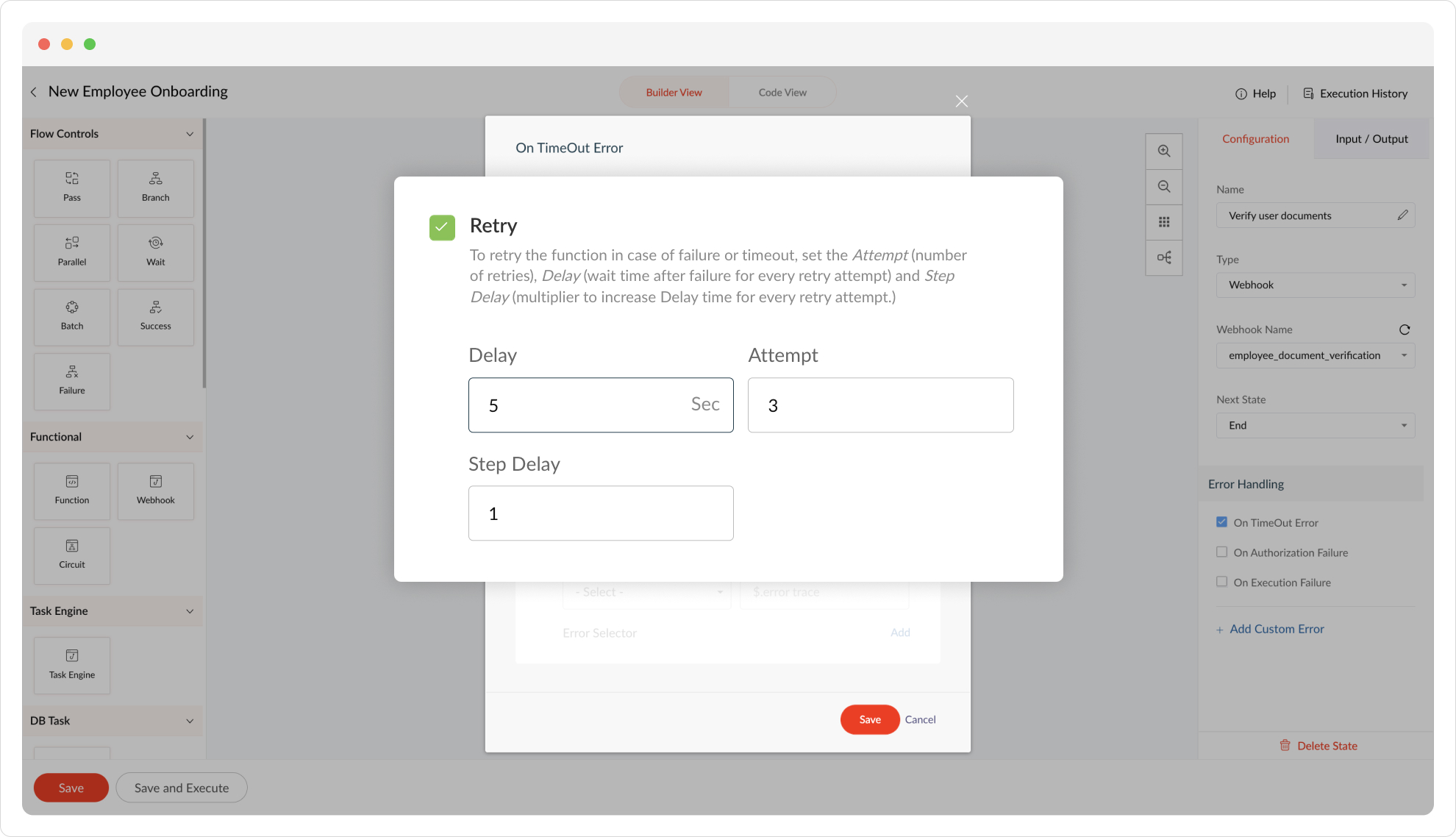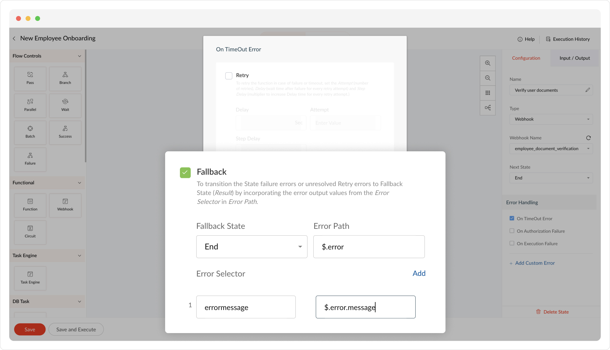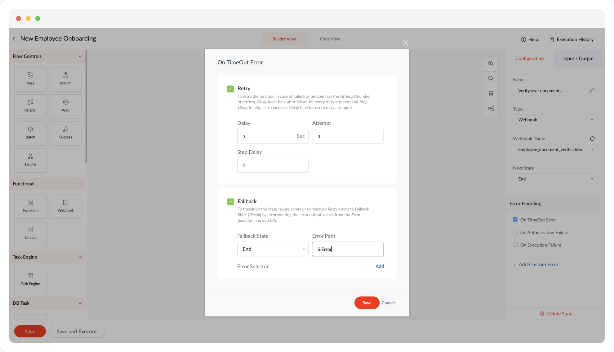When a functional state runs longer than the expected time, a timeout error occurs. This option is available for Function and Webhook. For handling timeout errors in Code View, the field value "errorType": "Error.TimeOut" will be added.