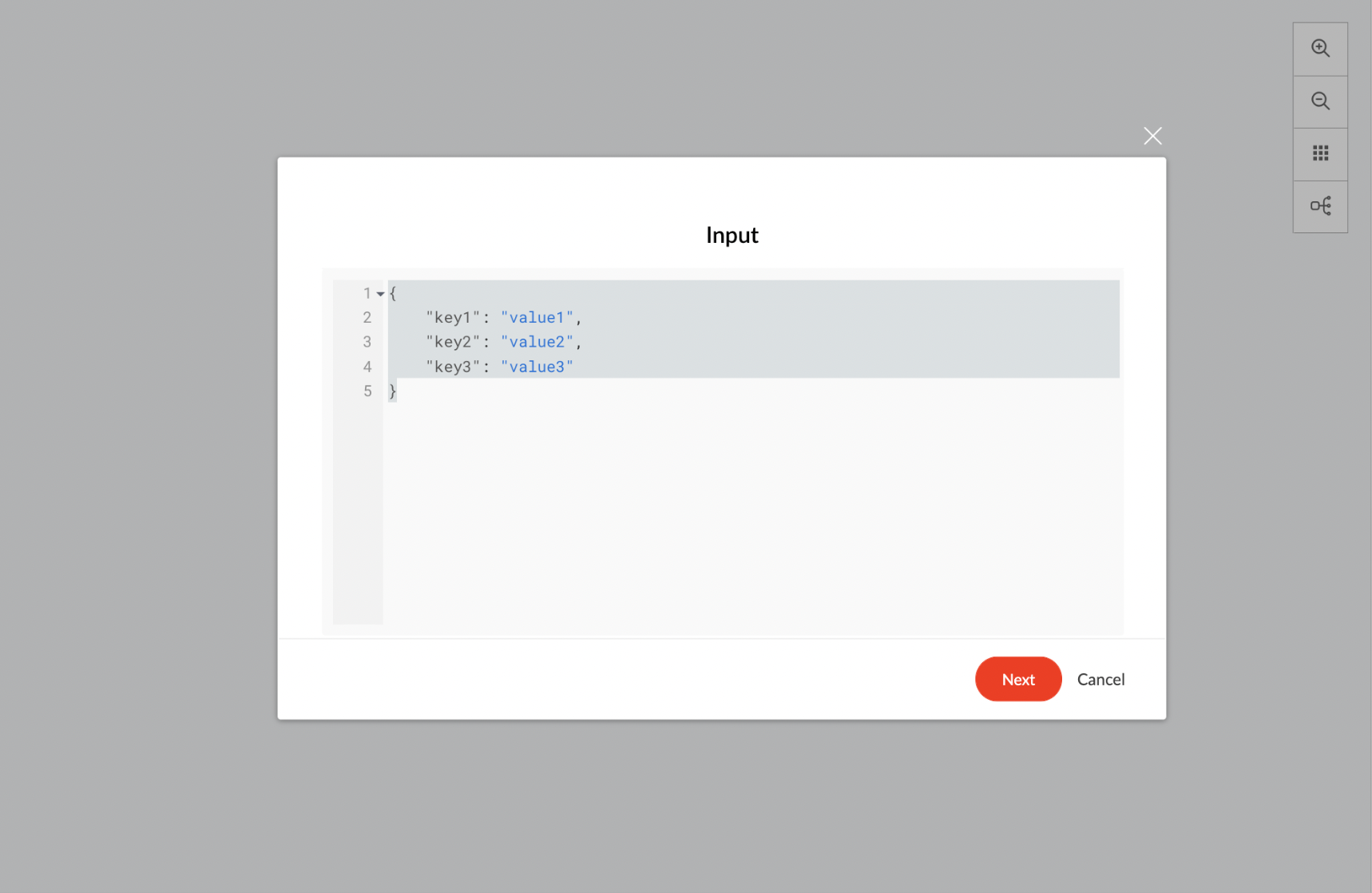 When you choose Save and Execute, a pop-up will appear with predefined JSON input. If required, you can edit the JSON input with the preferred data (in key-value pairs) and click Next.
