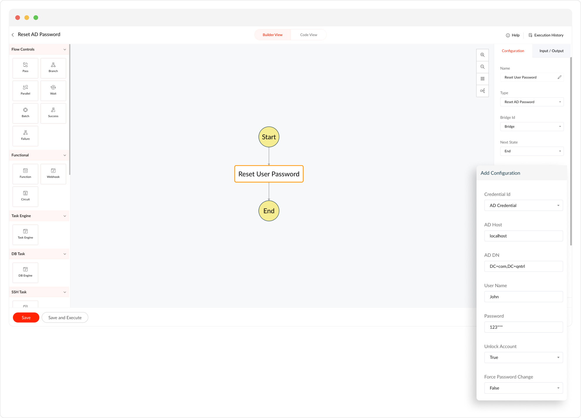 "Reset User Password": {"type": "reset_ad_password","next": "End","start": true,"bridge_id": "bridge-employee onboarding","payload": {"credential_id": "ad_credentials_3","ad_host": "localhost","unlock_account": true,"force_password_change": false,"ad_dn": "DC=com,DC=qntrl","password": "123***","user_name": "John"}}