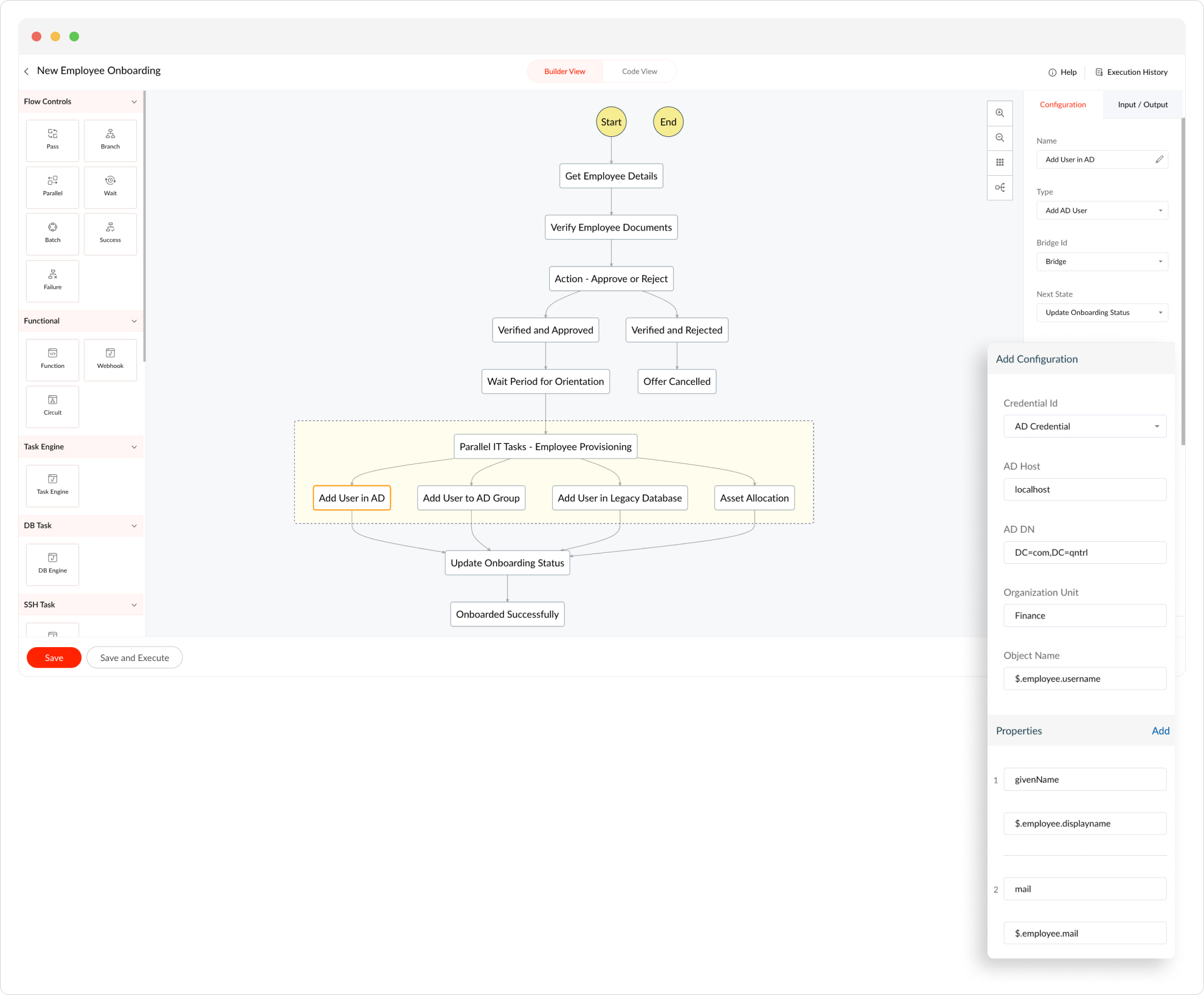 "Add User in AD": {"type": "add_ad_user","next": "Update Onboarding Ticket Status","bridge_id": "bridge-employee onboarding","payload": {"credential_id": "ad_credentials_3","ad_host": "localhost","ad_dn": "DC=com,DC=qntrl","organization_unit": "Finance","object_name": "john.mathew","properties": {"givenName": "John Mathew",}}}