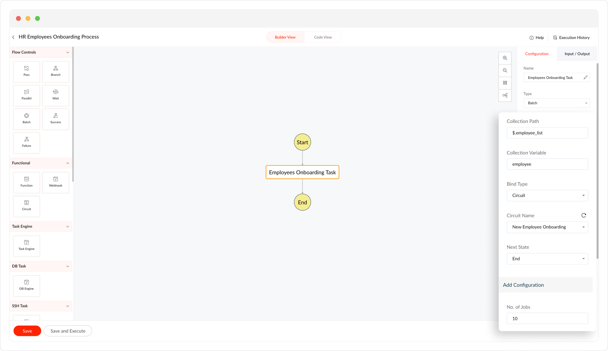 Now, let's configure a Batch state in Builder View and Code View for executing multiple employee onboarding circuits as a batch.