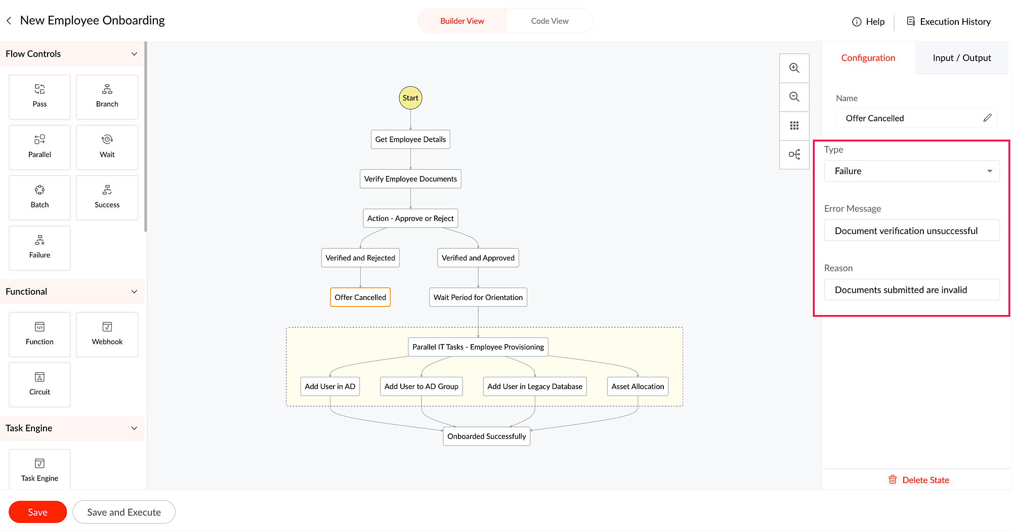 The below JSON is used in Code View and the equivalent fields for adding failure details are errorMessage and reason.