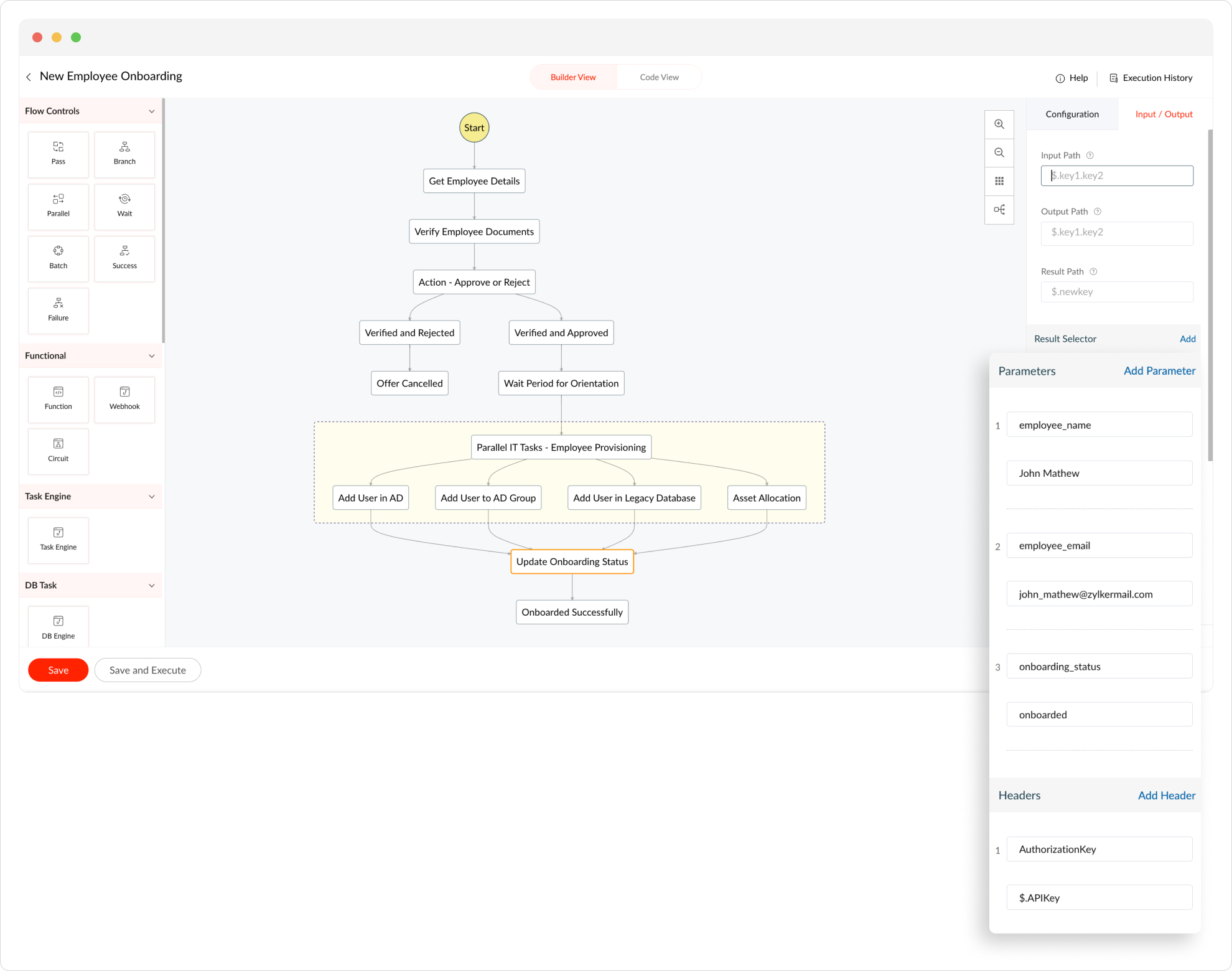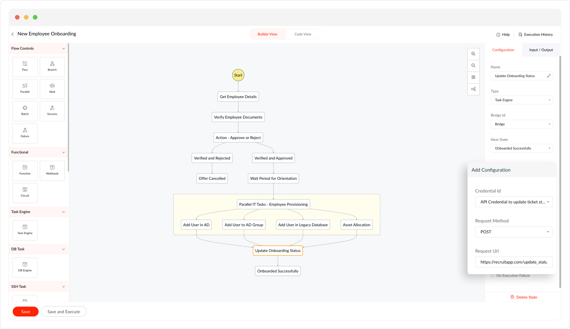 "Update Onboarding Status": {"type": "task_engine","next": "End","payload": {"credential_id": "api_cred_1","method": "POST","parameters": {"employee_name": "John Mathew","employee_email": "john_mathew@sweriomail.com","onboarding_status": "onboarded"},"headers": {"AuthorizationKey": "$.APIKey"}},"bridge_id": "bridge-employee onboarding"}