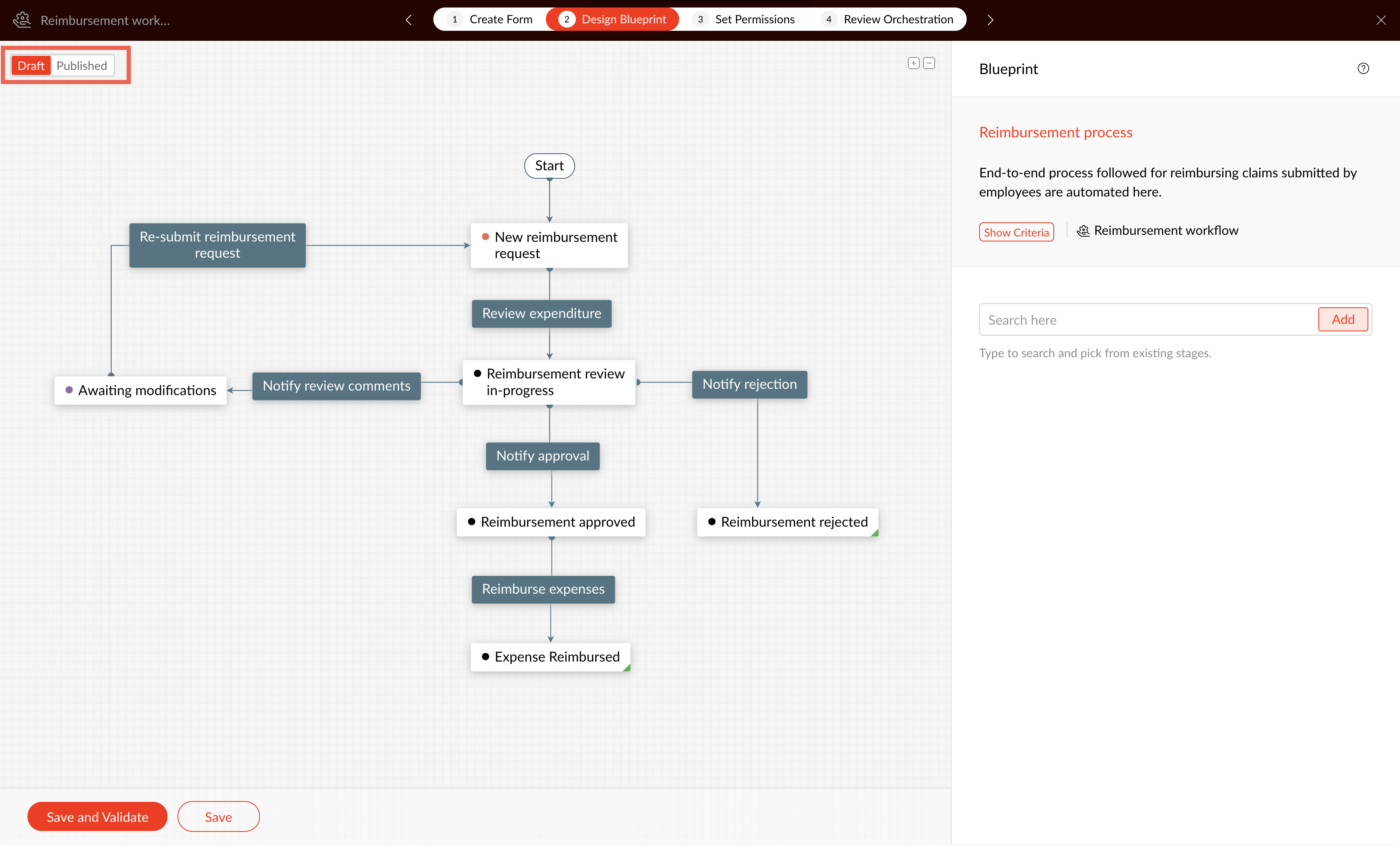 If a Blueprint is not published, it can be saved as a draft . Drafts will be available for you to experiment with, without affecting any existing records. You can toggle between the Draft and Published versions in the Blueprint Editor.