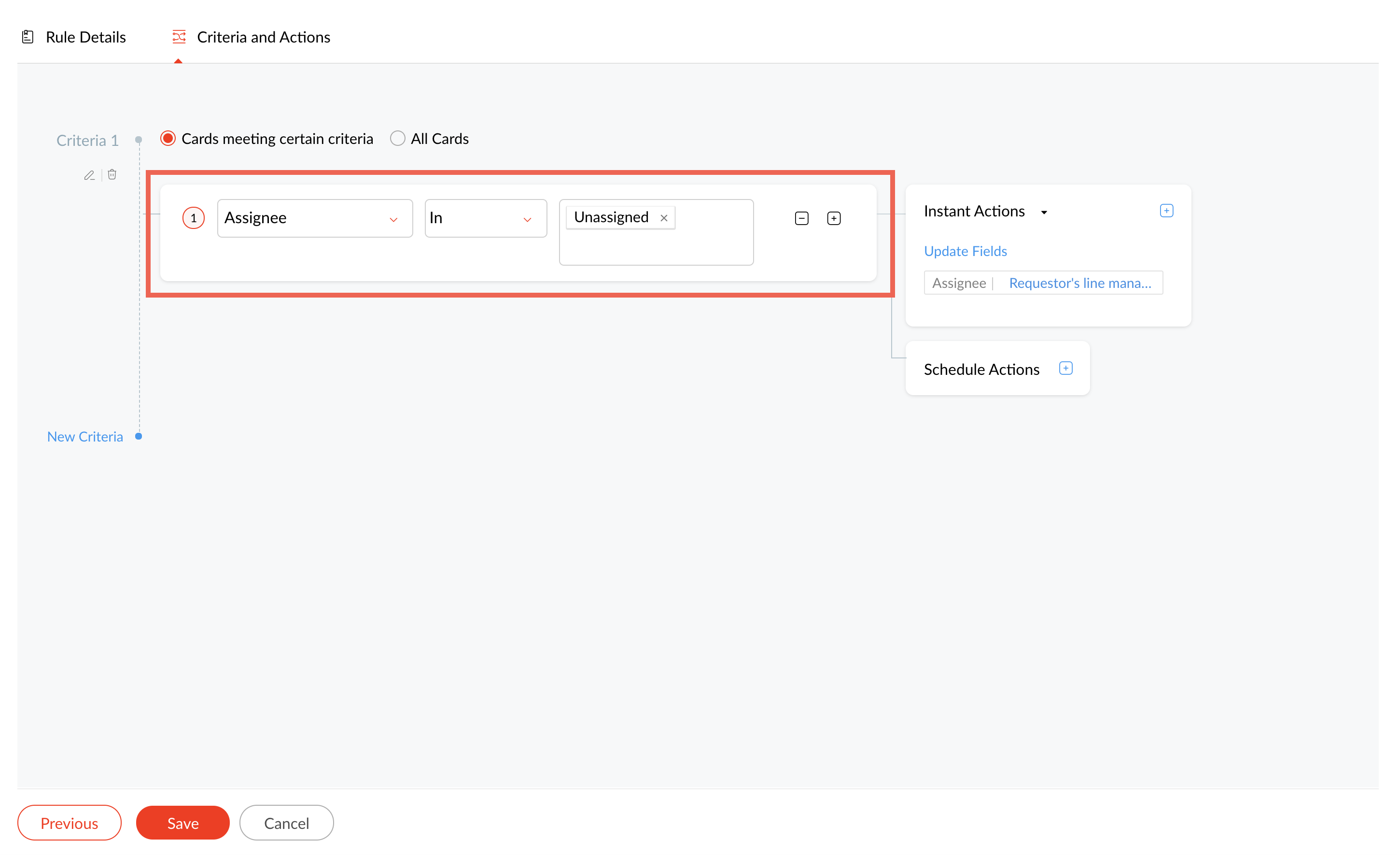 Setting criteria allows you to filter cards based on a condition and execute instant or scheduled actions based on that criteria. For example, when a card is not assigned to any one , the card should automatically be assigned to the requestor's line manager.