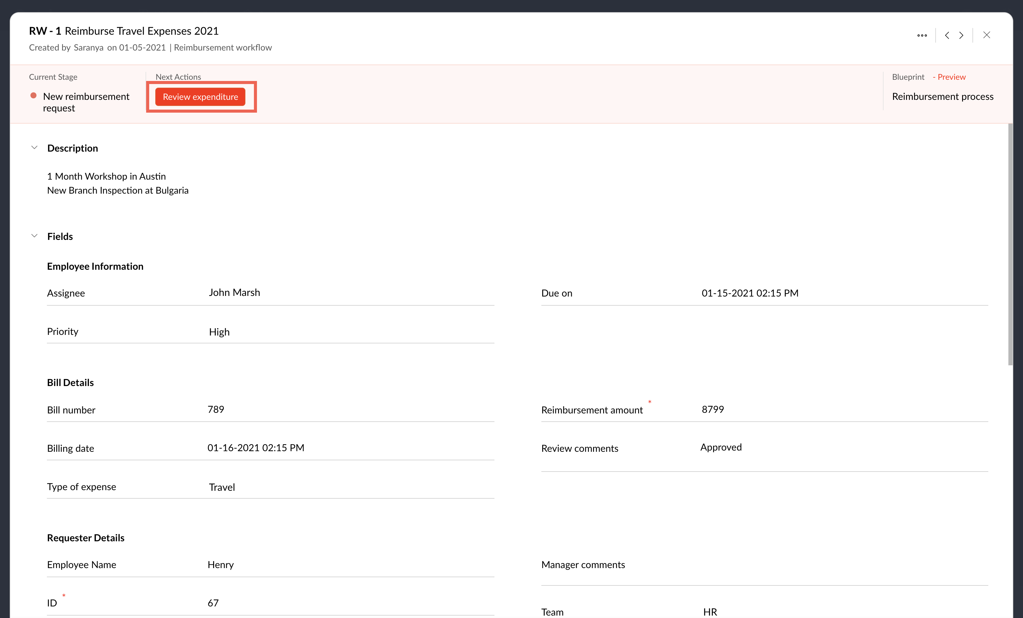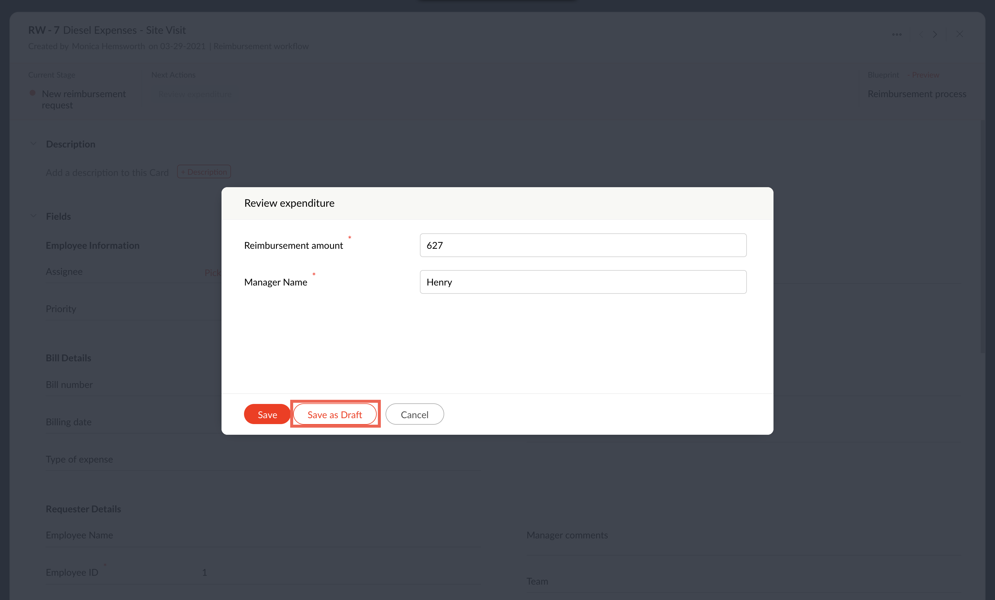 Click on the "Review expenditure" transition button, provide the required field details and click the Save as Draft button.