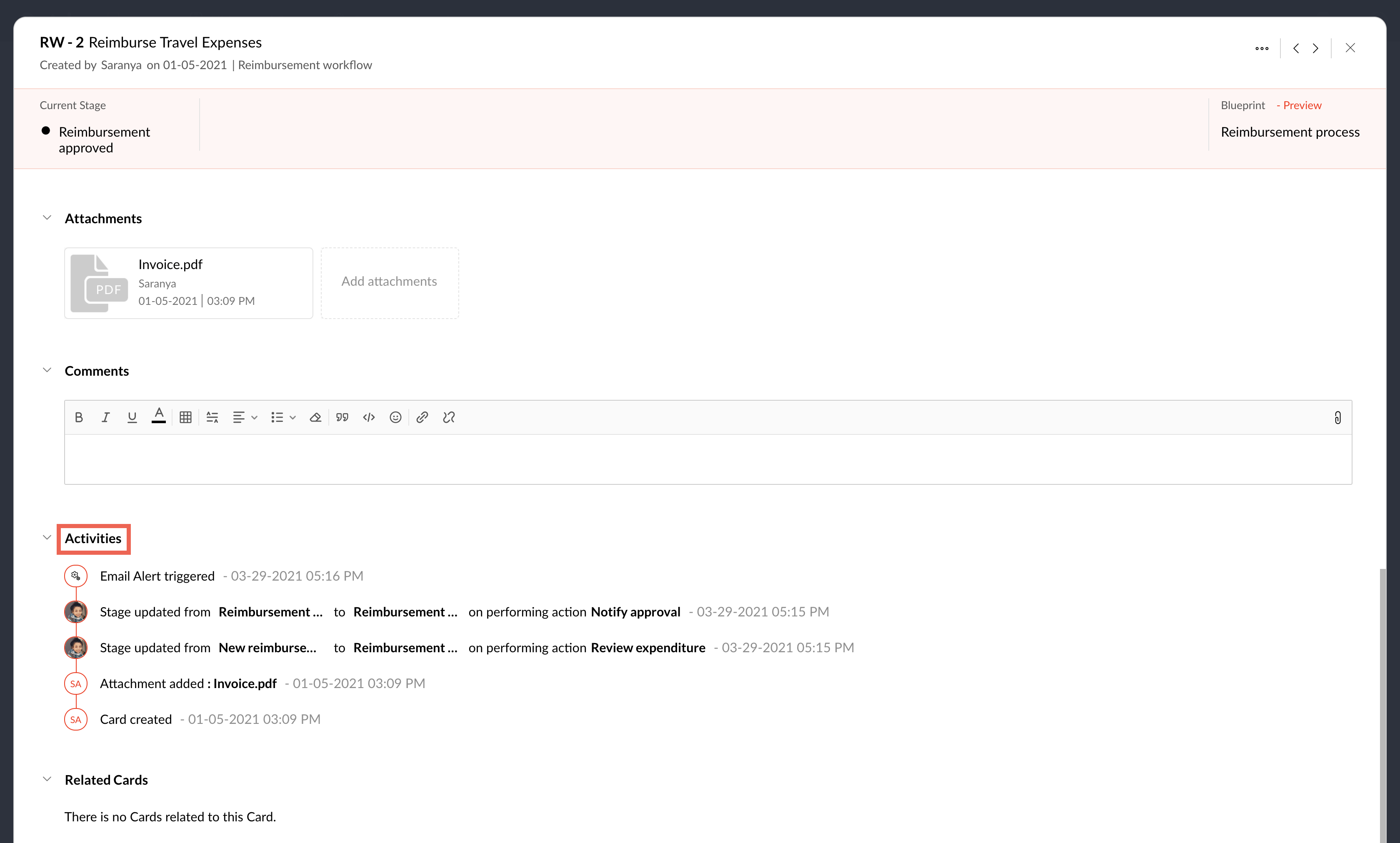 2. Scroll down to the Activities section to view all the actions performed in the card.