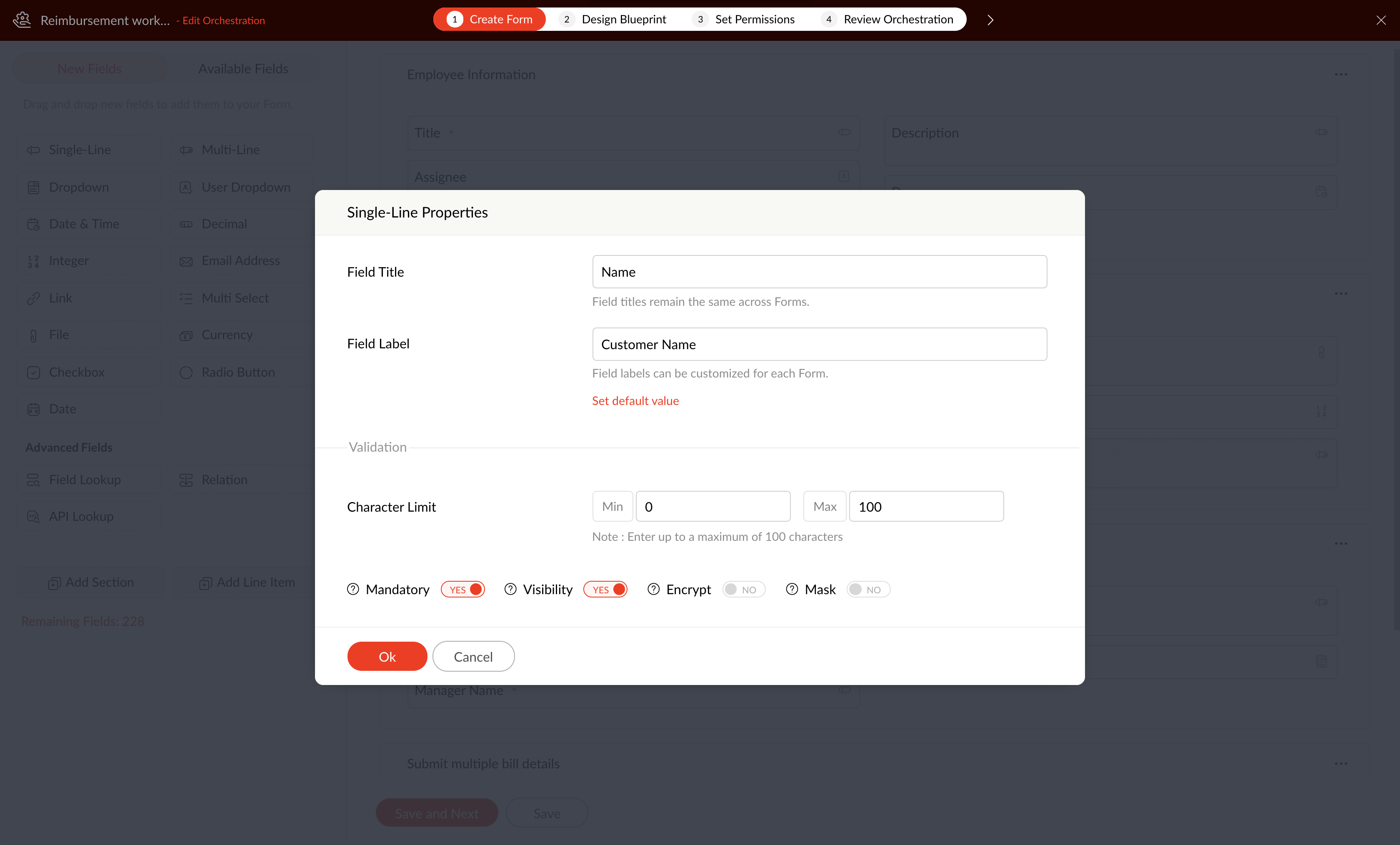 To reuse fields in different forms, drag the relevant field from the Available Fields section in the left pane of the form, then enter a new field label for the field.