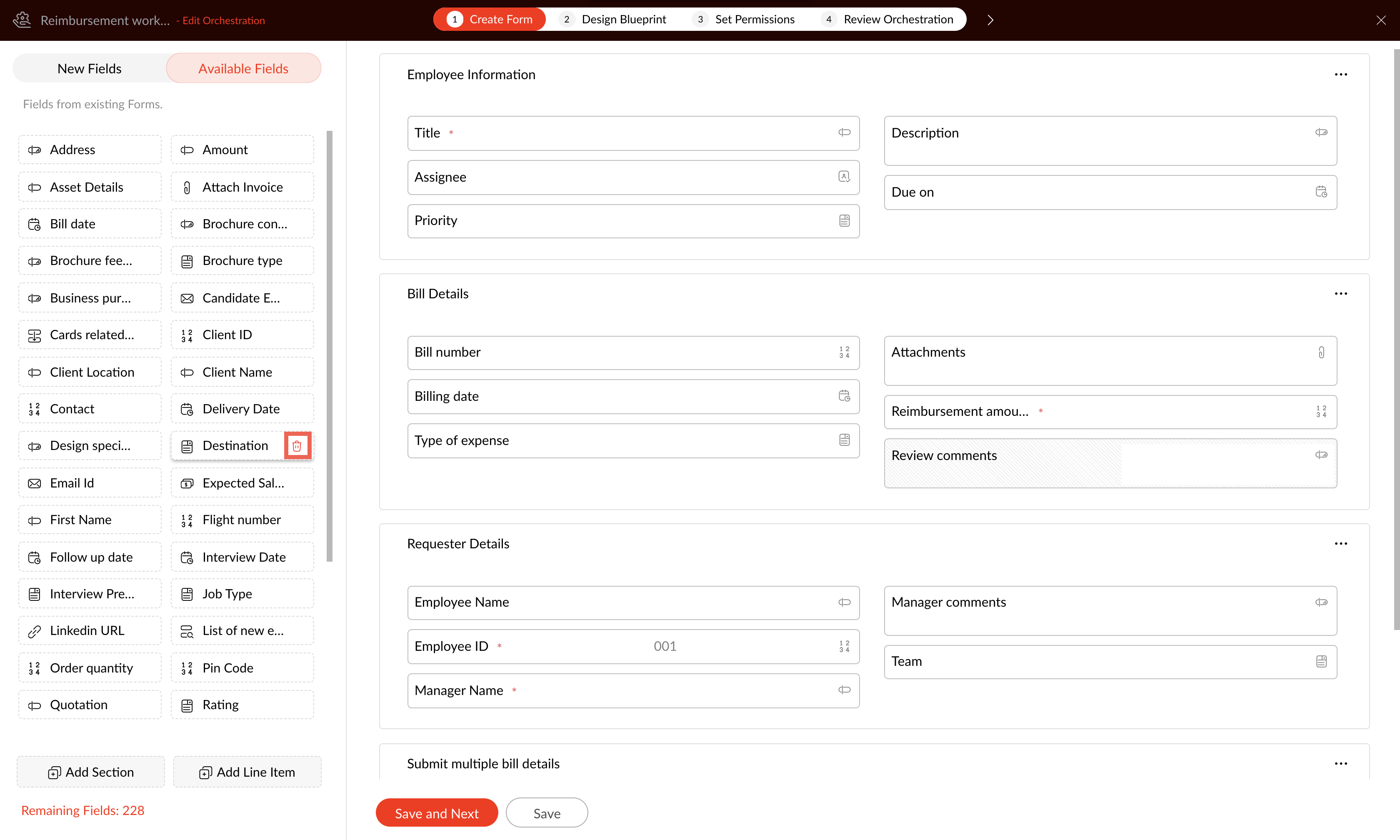 The fields created in Qntrl are present in the  Available Fields section of the forms. H over over a field name and click the delete icon to delete a field permanently.