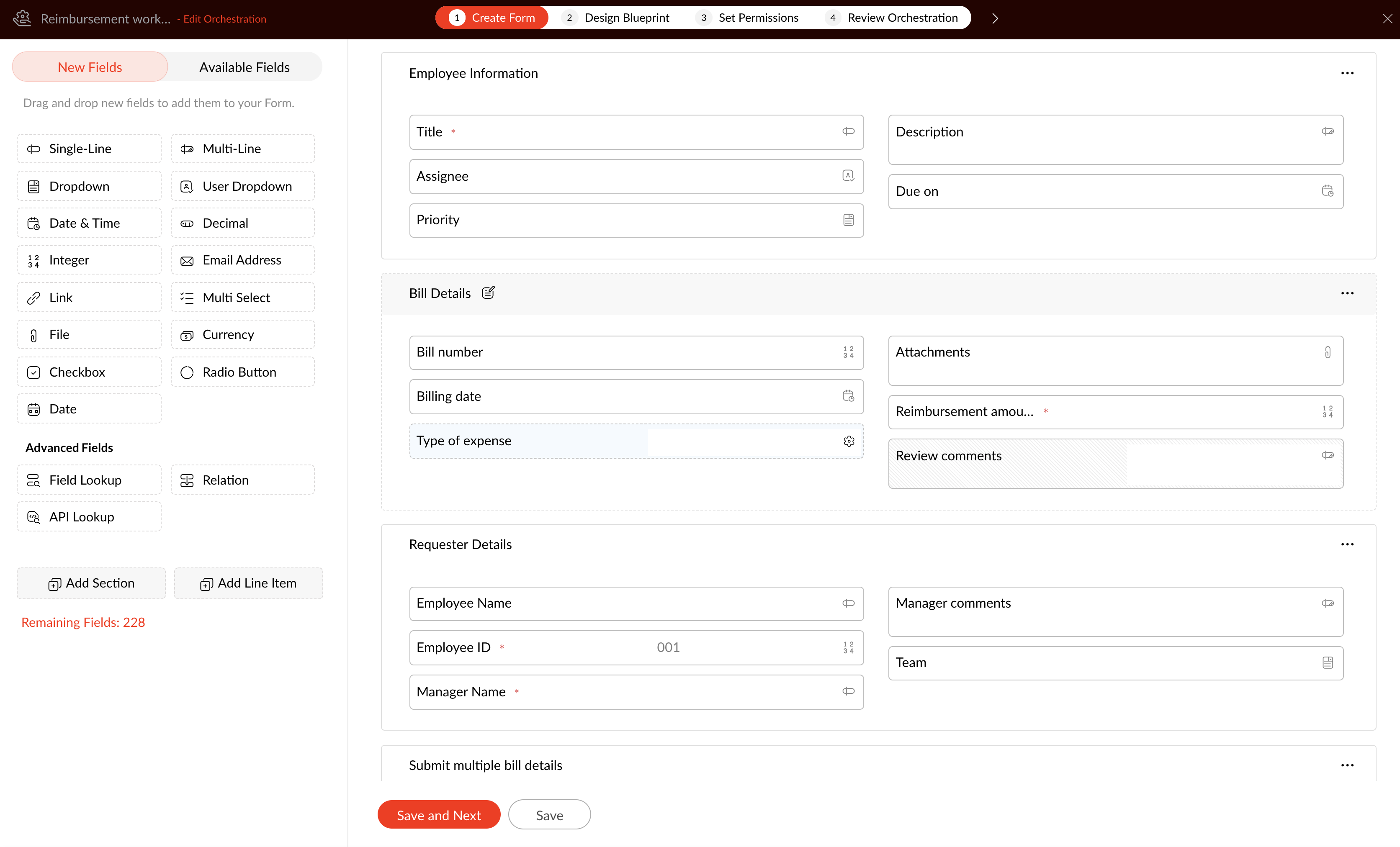 For example, to automate your organization's reimbursement process, you can create a new form by adding fields to gather details about the reimbursement. Later, you can build a blueprint to define the reimbursement process. Once the process is automated using forms and blueprints, employees in your organization can request reimbursement by creating Cards , where the form fields are filled.